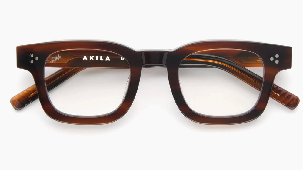The AKILA ASCENT RX features a bold, chunky square silhouette crafted from high-quality acetate in a rich tortoiseshell brown gradient coloring. The frames showcase substantial thickness with a distinctive rectangular shape and clean lines. The classic tortoise pattern varies in intensity, creating an elegant depth effect from darker edges to lighter center tones. Small silver rivets accent the front corners, adding a subtle metallic detail. The temple arms maintain the same substantial build and matching tortoise coloring, creating a cohesive, sophisticated look suitable for any face shape.