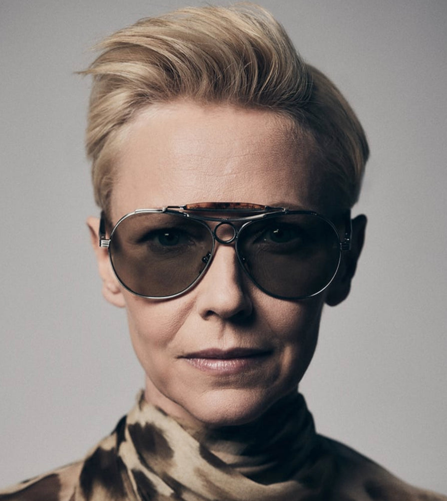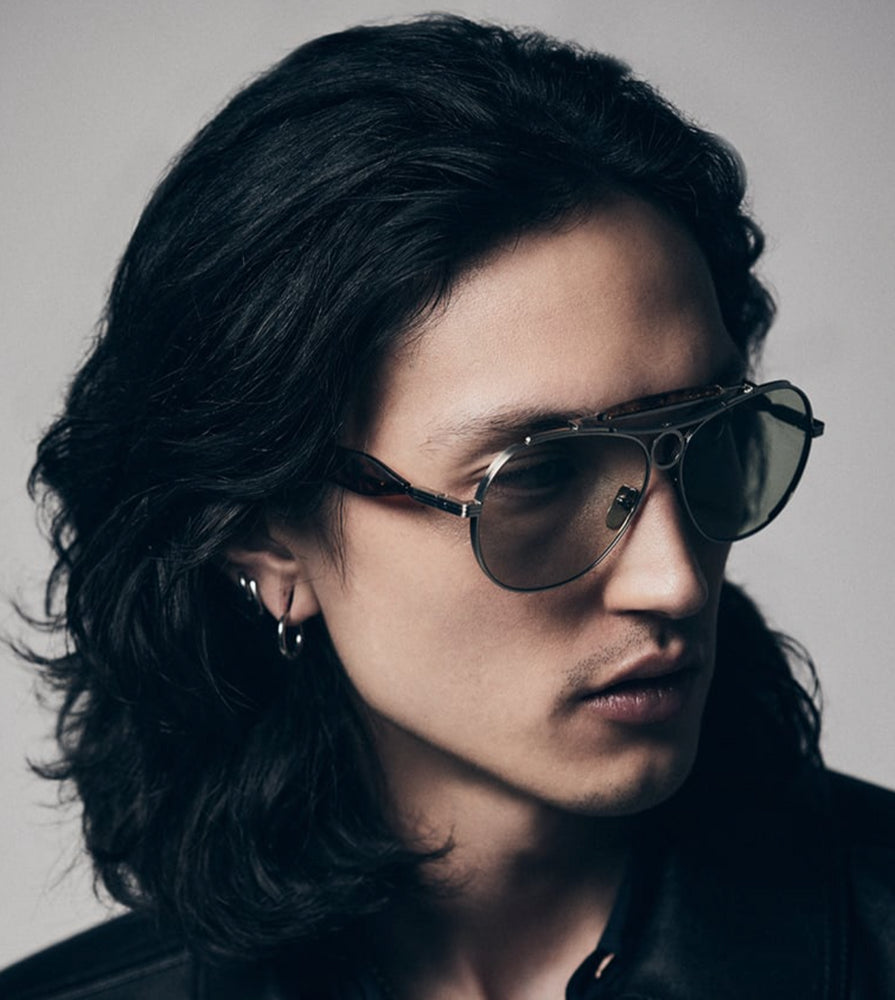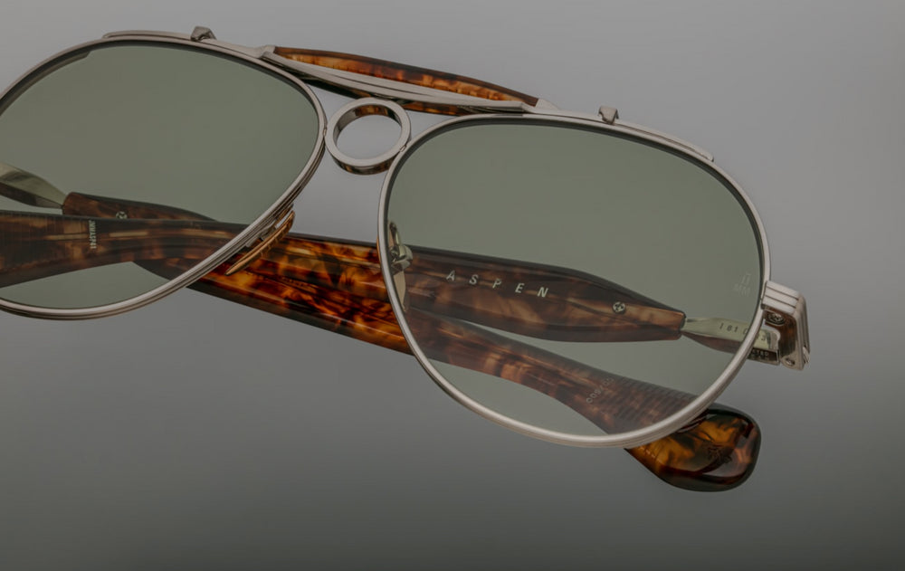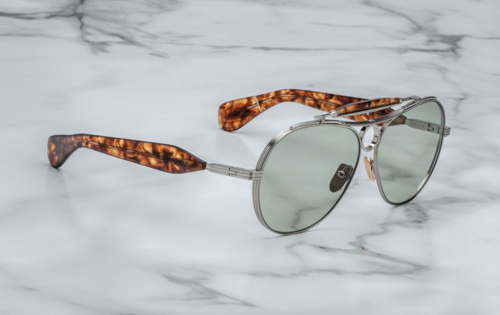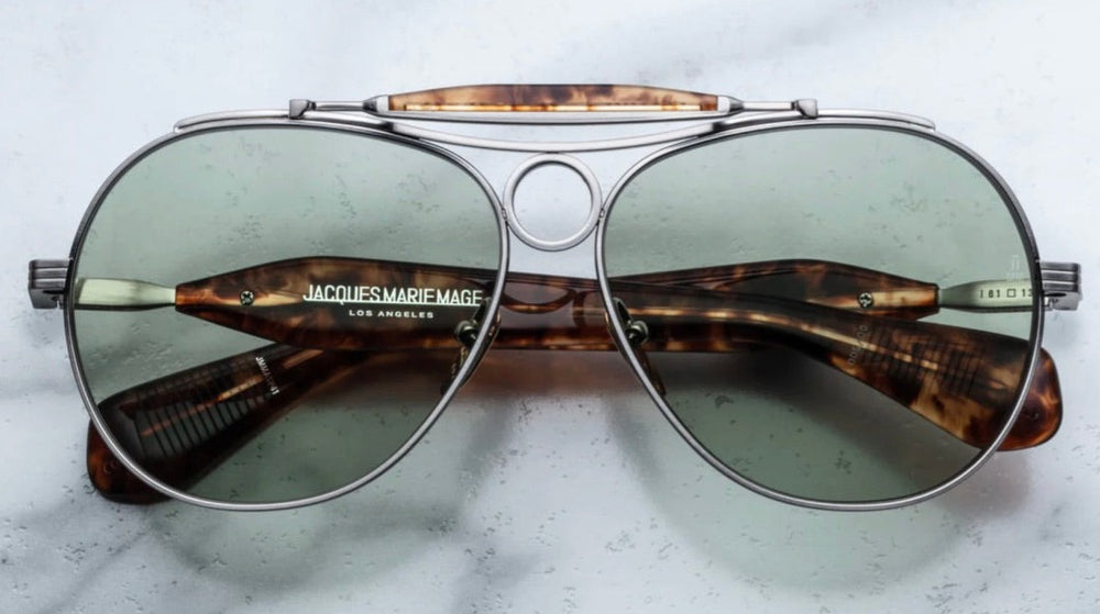 The Jacques Marie Mage Aspen is a luxurious aviator-style frame featuring a sleek silver metal construction with elegant tortoiseshell temple arms. The design incorporates classic aviator elements with a refined modern twist, featuring green-tinted lenses and adjustable nose pads for comfort. The frame showcases sophisticated detailing with a subtle top bar and brand marking on the temple. The combination of metal framework and tortoiseshell accents creates a premium, vintage-inspired aesthetic that speaks to both heritage and contemporary luxury eyewear design.