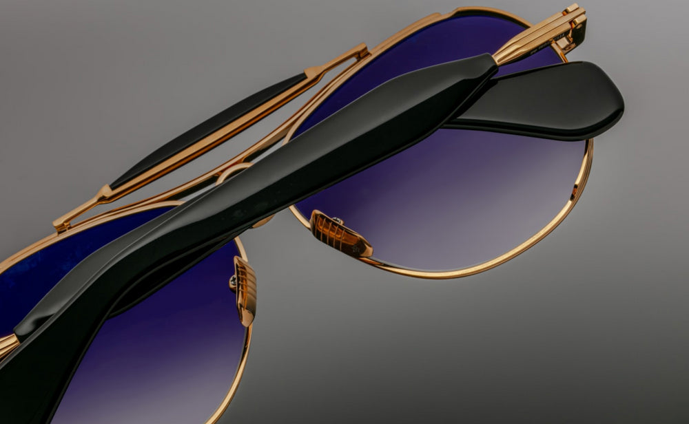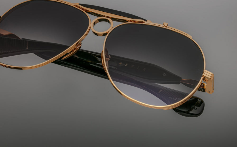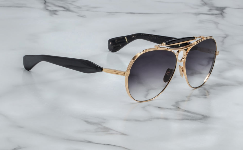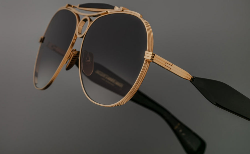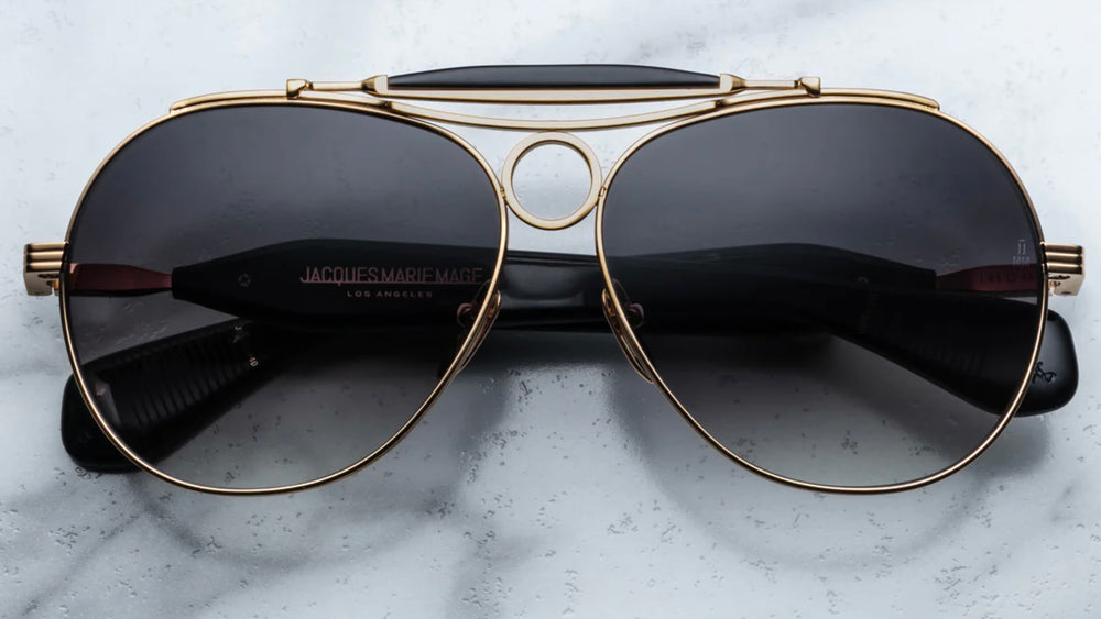 These JACQUES MARIE MAGE Aspen sunglasses feature a classic aviator silhouette with a luxurious gold-tone metal frame. The design includes distinctive double bridge construction and sleek nose pads. The gradient grey lenses are complemented by elegant temple arms with subtle detailing. The frame exhibits sophisticated vintage-inspired elements with modern refinement, featuring delicate line work and premium construction throughout. The sunglasses demonstrate a perfect balance of retro glamour and contemporary luxury styling.