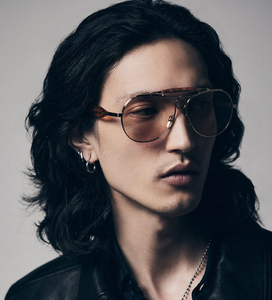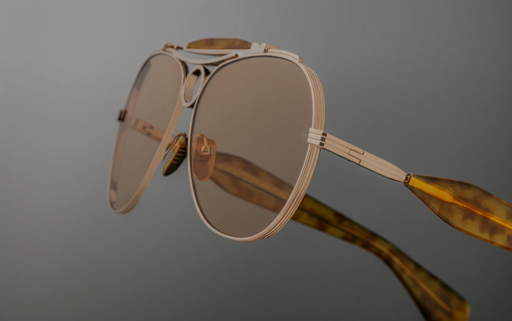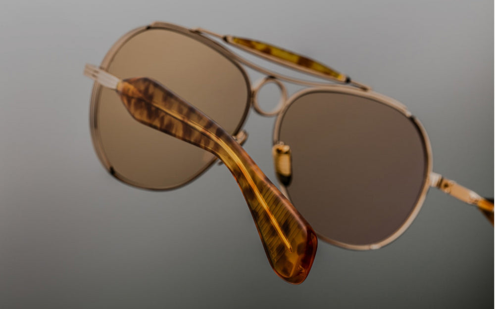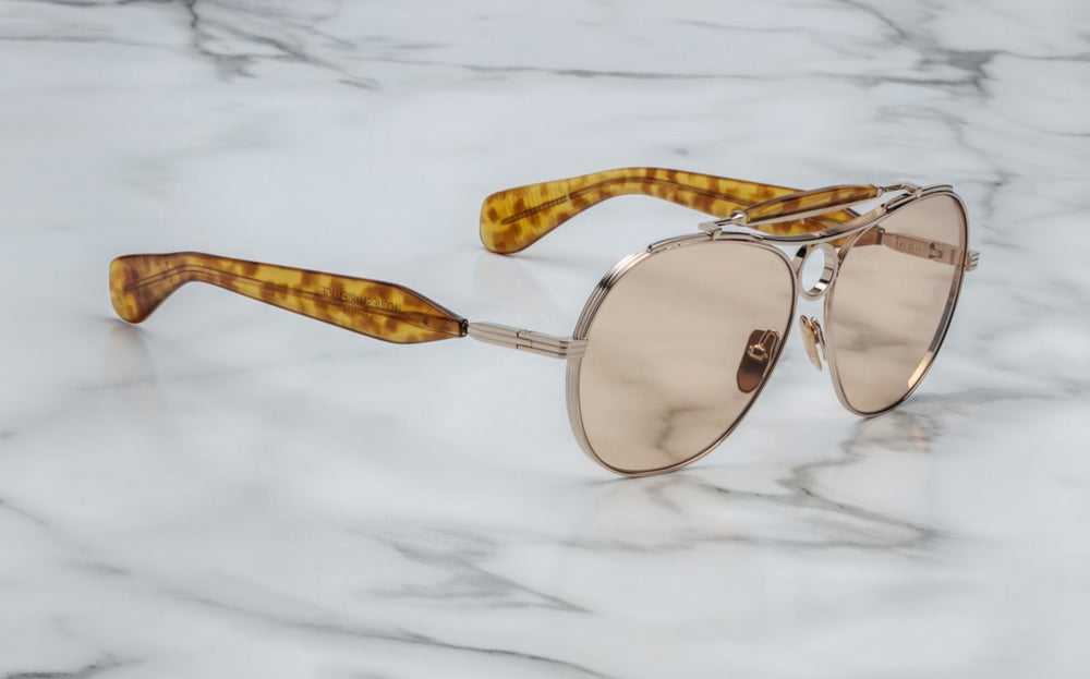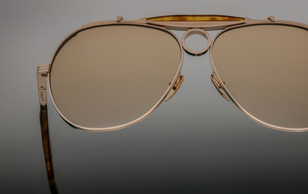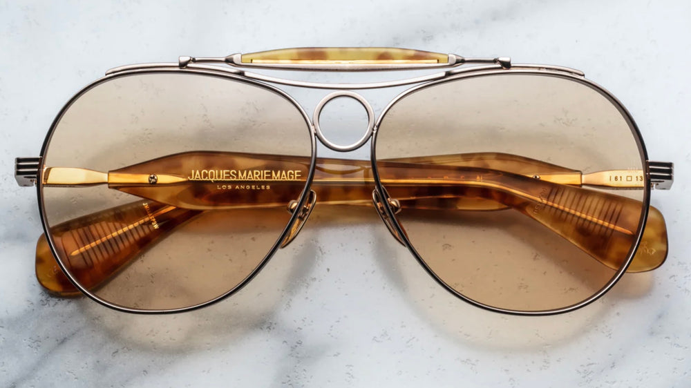 A luxurious vintage-inspired aviator frame from Jacques Marie Mage Los Angeles featuring a sophisticated gold-toned metal frame with double bridge construction. The sunglasses showcase amber-tinted lenses and elegant tortoise temple tips. The design balances classic aviator styling with premium materials and expert craftsmanship, exemplified by the detailed nose pad arms and slim profile. The frames proportions are well-balanced, with delicate metalwork that gives it a refined, timeless appeal suitable for sophisticated wardrobes.