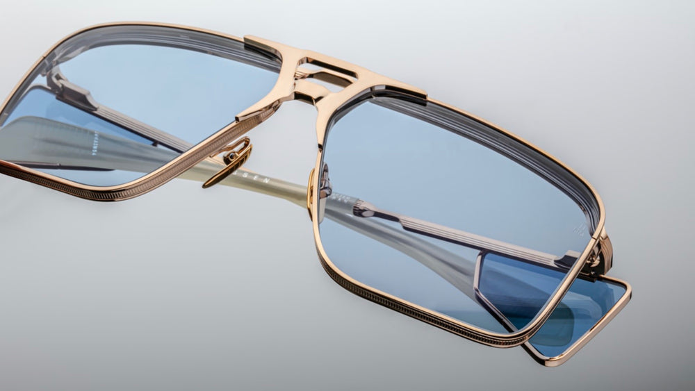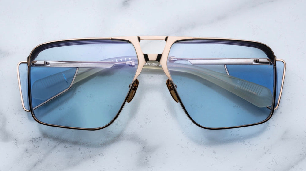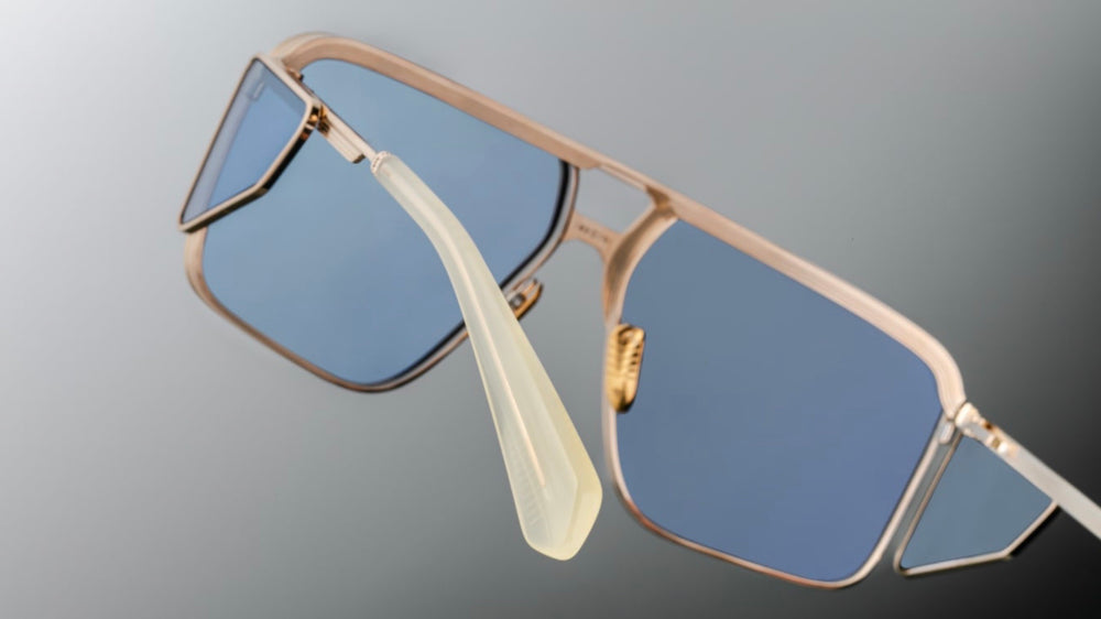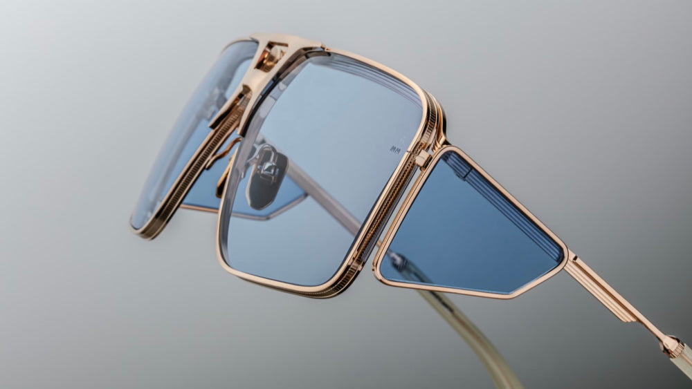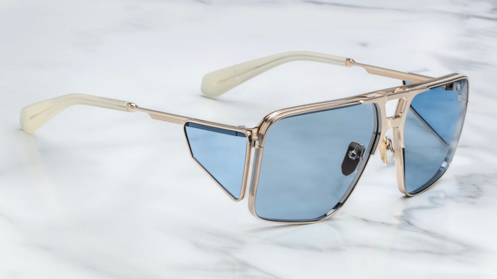 A luxurious pair of oversized geometric sunglasses featuring a sleek gold-toned metal frame with architectural details. The distinctive silhouette combines retro and modern elements with a bold geometric shape and blue-tinted lenses. The design showcases clean lines with subtle angular details at the temple junction and a minimalist double-bar bridge construction. These sophisticated sunglasses embody both vintage glamour and contemporary styling, perfect for making a refined fashion statement.