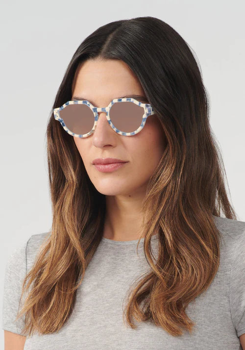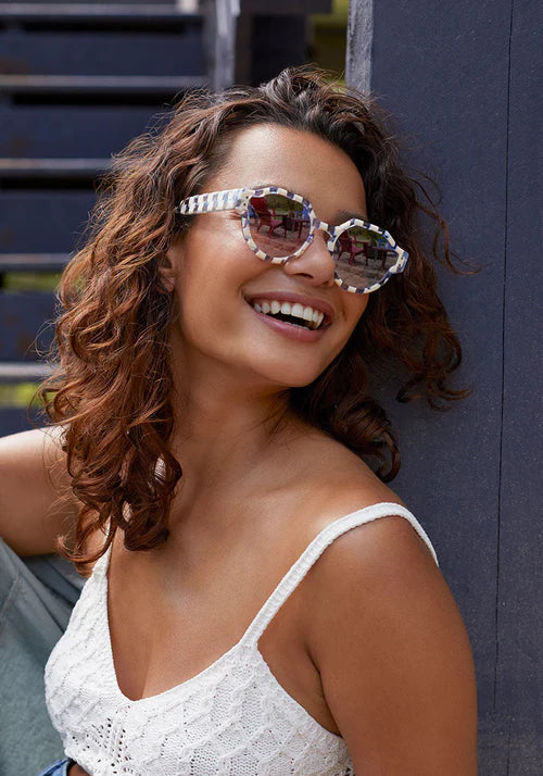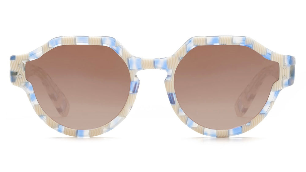 These stylish round sunglasses feature a unique striped pattern in cream and light blue colors creating an artistic marbled effect throughout the frame. The lenses are a gradient brown tint. The frame has a classic circular silhouette with a medium thickness and appears to be made from high-quality acetate plastic. The design is sophisticated yet playful, perfect for fashion-forward individuals looking for a distinctive summer accessory. The pattern resembles a delicate watercolor or porcelain design, giving these frames an artistic, handcrafted feel.