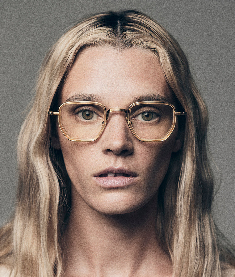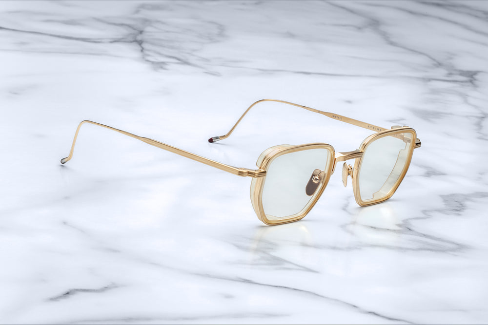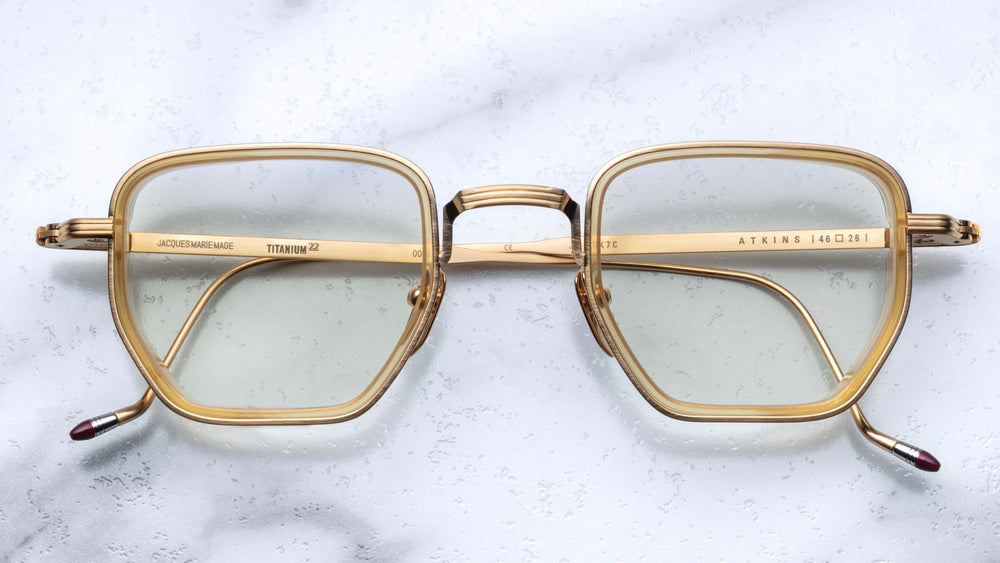 An elegant pair of hexagonal titanium frames in a sophisticated gold finish. The design features delicate temple arms with burgundy-tipped ends, creating a refined vintage-inspired aesthetic. The angular geometric shape is complemented by slim nose pads and a minimalist bridge design, making these glasses both lightweight and stylish. The frames showcase excellent craftsmanship with precise detailing and a balanced proportion that would suit many face shapes.