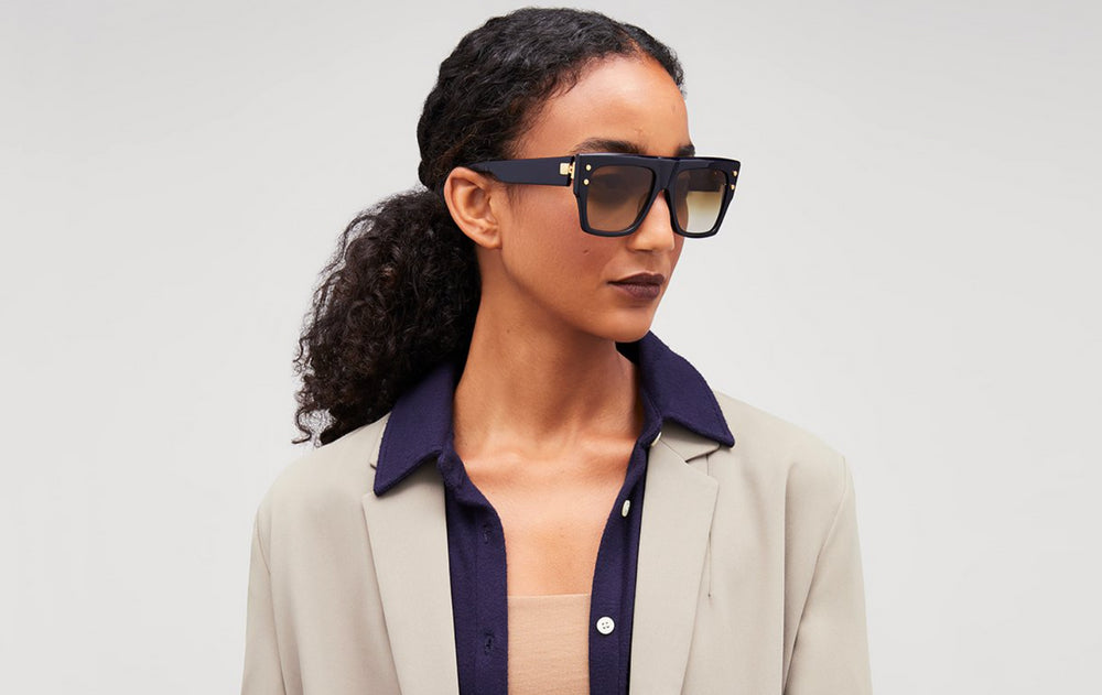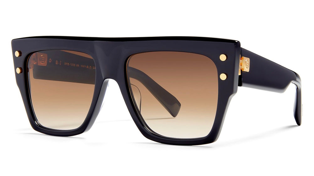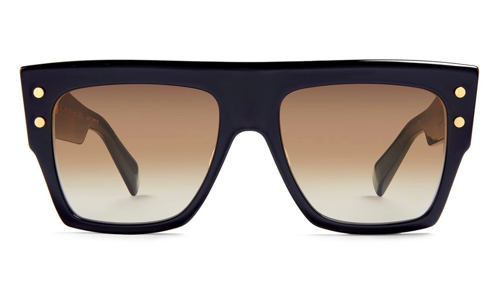Luxurious oversized square sunglasses with a bold, flat-top design featuring gold stud accents at the corners. The frame has a glossy black finish with gradient brown lenses that fade from dark to light. The design incorporates distinctive thick temples and a substantial frame construction that creates a dramatic, fashion-forward silhouette. The sleek minimalist bridge complements the bold frame structure, making these sunglasses a statement piece that combines contemporary style with classic elegance.