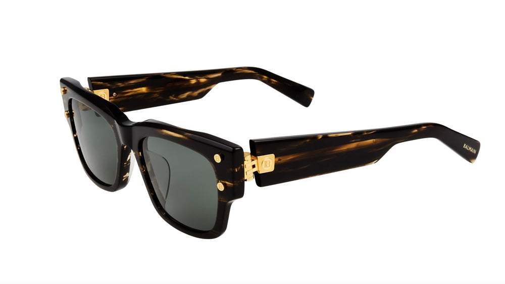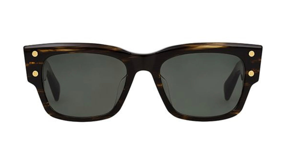 Classic wayfarer-style sunglasses with a luxurious dark tortoiseshell acetate frame. Features distinctive gold stud details on both temples, giving it an upscale, designer aesthetic. The frame has substantial thickness and presence, with dark grey lenses that provide excellent sun protection. The overall design balances classic styling with modern luxury detailing.