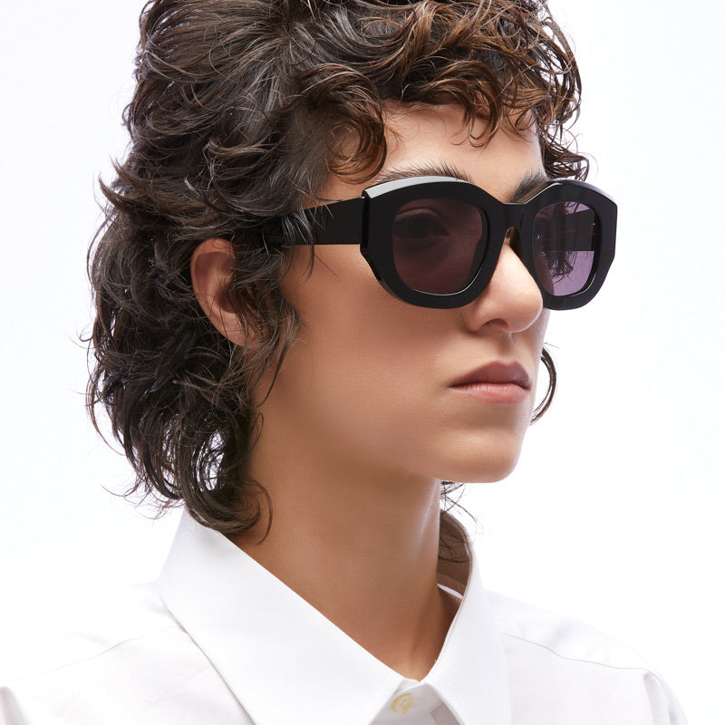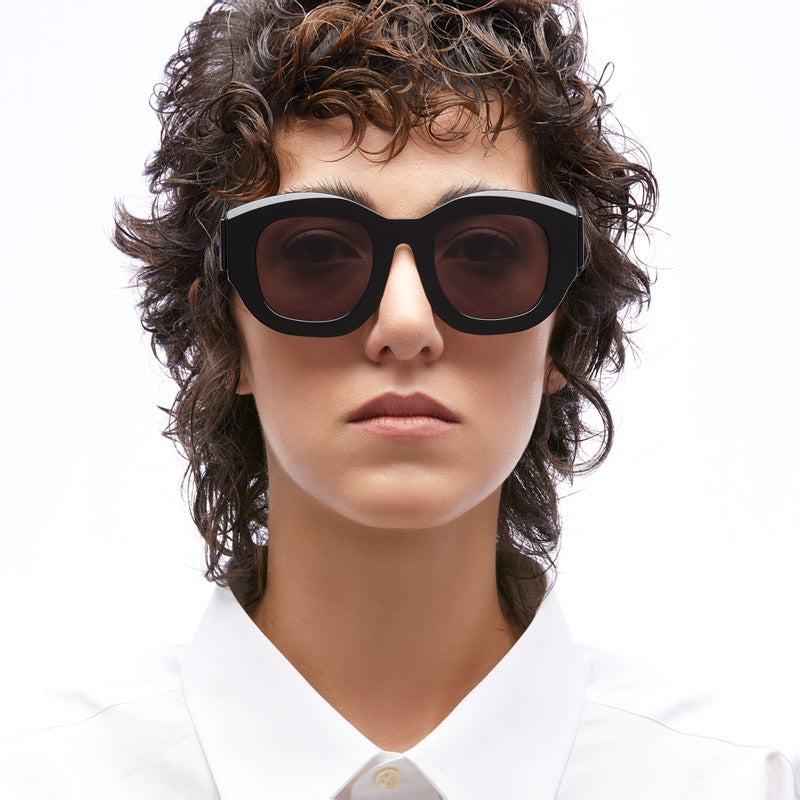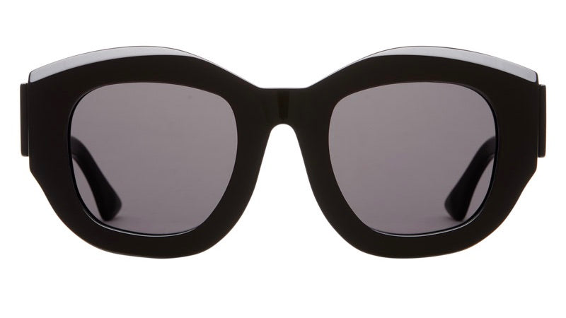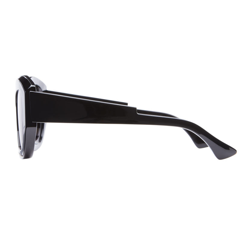 Bold, avant-garde oversized geometric sunglasses with a distinct architectural feel. The frame features a chunky, dramatic silhouette with angular cuts and a contemporary minimalist design. The thick black frame creates a strong statement piece with a luxurious matte finish. The substantial temple arms complement the bold front design, creating a balanced, high-fashion look suitable for the style-conscious wearer. The lenses are set in deep bevels, adding to the sculptural quality of these statement sunglasses.