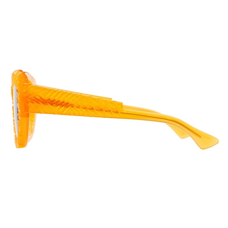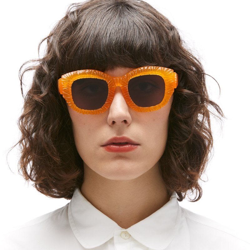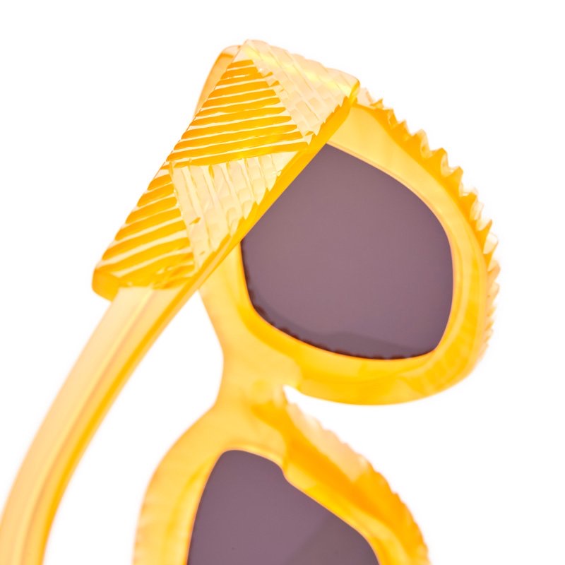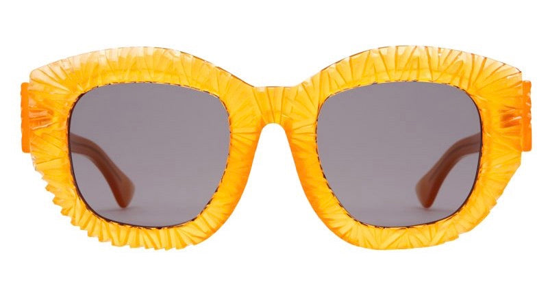Bold and artistic oversized square sunglasses featuring a unique textured, ruffle-like pattern around the frames that resembles sunflower petals or a lions mane. The chunky yellow plastic construction has a semi-translucent quality that catches light beautifully. The design is avant-garde and statement-making, with a sculptural quality that transforms these sunglasses into wearable art. Dark grey lenses provide contrast against the bright yellow frame. The overall aesthetic is both playful and high-fashion, suitable for those looking to make a strong style statement.