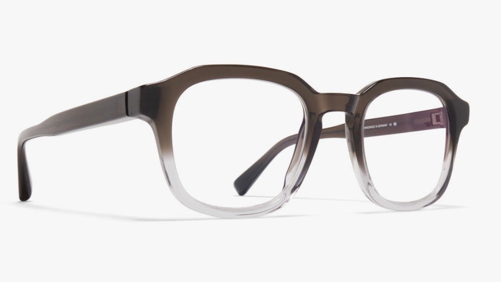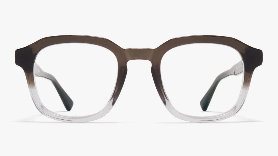 These sophisticated eyeglasses feature a unique ombre effect transitioning from a smoky brown at the top to a translucent grey at the bottom. The frame has a contemporary square silhouette with softly rounded edges, creating a modern yet versatile look. The material appears to be high-quality acetate with a matte finish, offering both durability and style. The design is minimalist and architectural, making it suitable for various face shapes and professional settings.