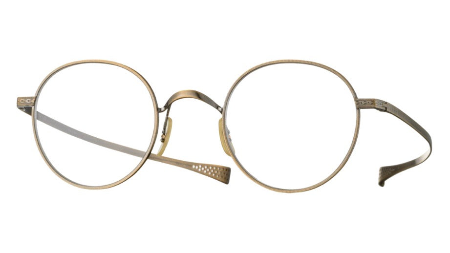 Elegant round vintage-style frames with a delicate bronze-tinted metal construction. Features minimalist design elements with thin rims and subtle perforated detailing on the temple arms. The classic round shape is complemented by slim nose pads and streamlined temple arms that curve gently behind the ears. The understated metalwork shows fine craftsmanship in the smooth connections and balanced proportions.