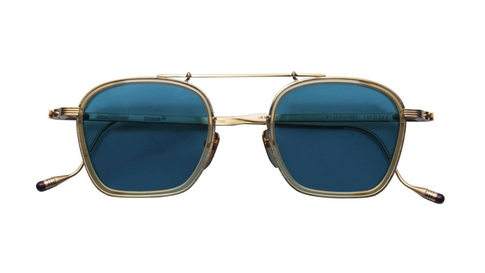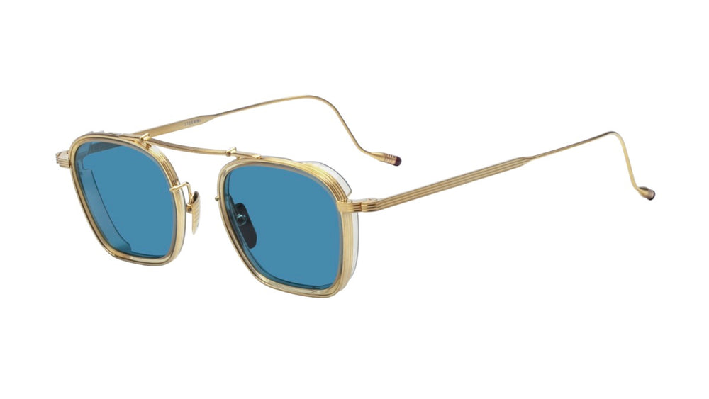 Sophisticated square-geometric sunglasses featuring a delicate gold metal frame with double bridge construction. The sleek design incorporates elegant wire temple arms and adjustable nose pads for comfort. The blue-tinted lenses are housed within a refined angular shape that brings a contemporary twist to a classic style. The frame exhibits exceptional craftsmanship with subtle architectural details and clean lines throughout.
