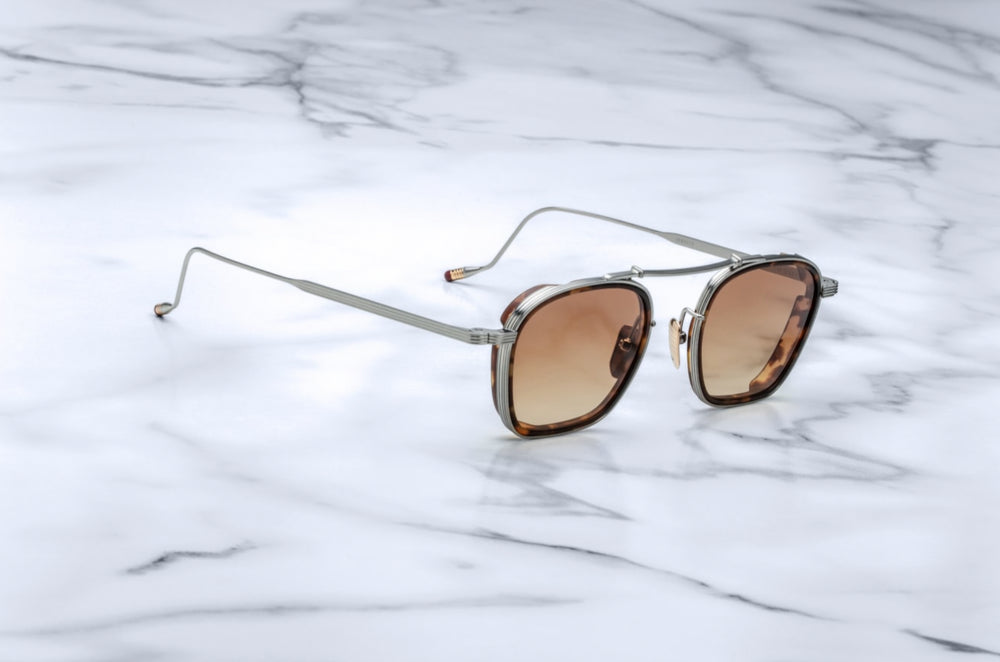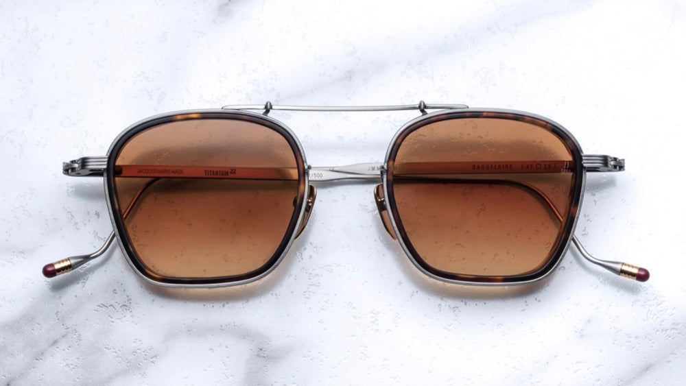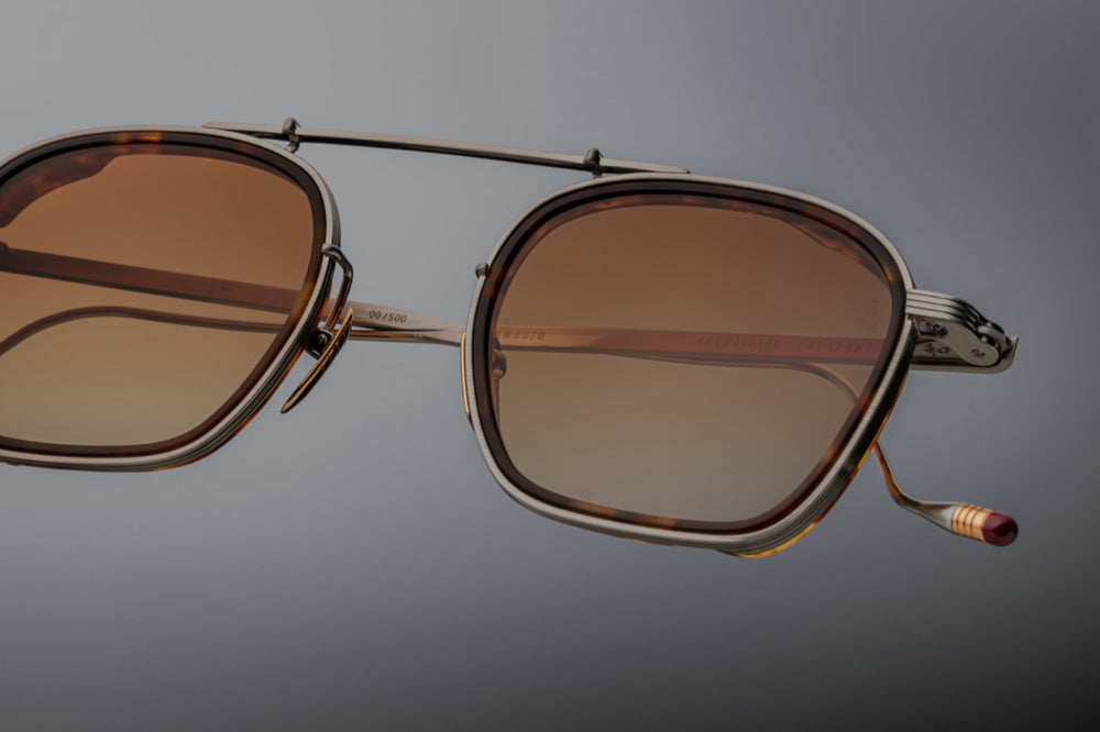 A sophisticated titanium double-bridge aviator-inspired frame with a distinctive geometric shape. The sunglasses feature a refined silver metal frame construction with subtle dark tortoise acetate rim detailing. The gradient brown lenses complement the metallic finish, while the slim temple arms feature subtle red-tipped ends. The frame demonstrates excellent craftsmanship with its precise angular cuts and balanced proportions, embodying a perfect blend of vintage aesthetics and contemporary design.