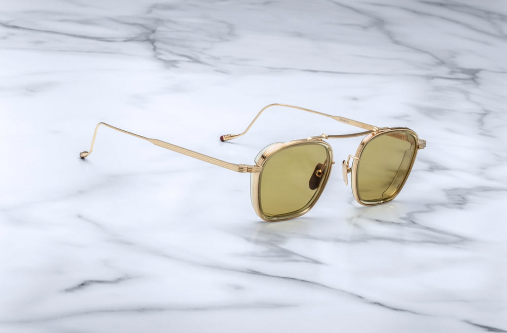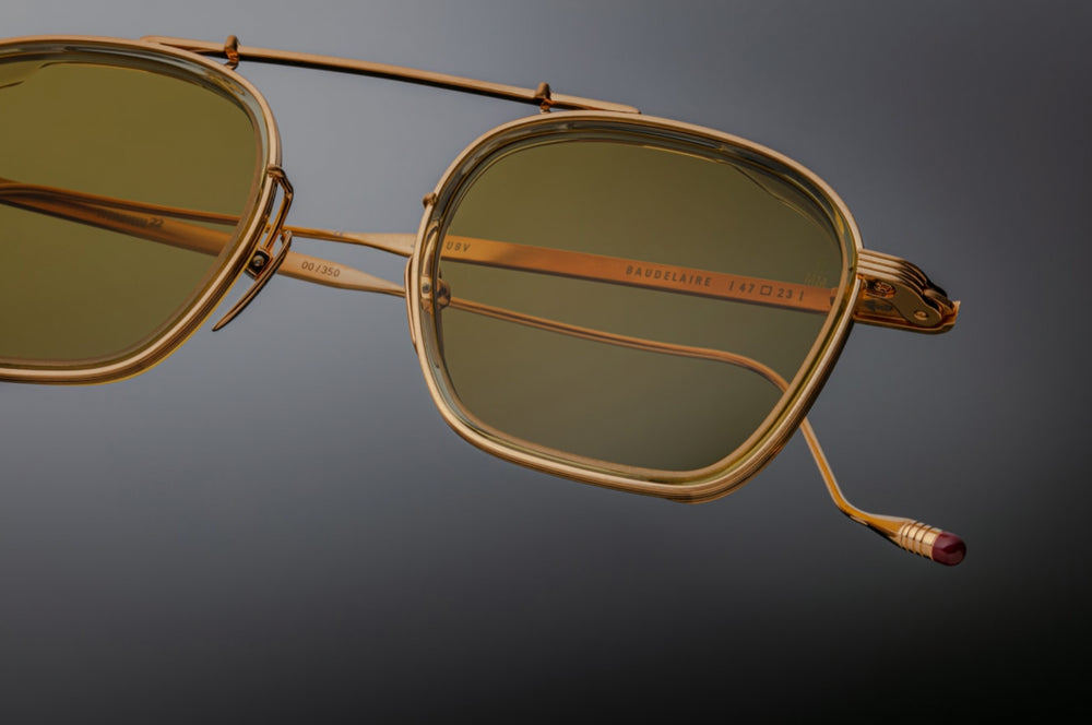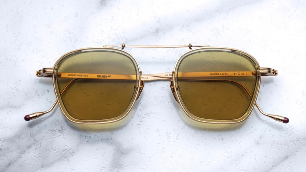 Sophisticated titanium geometric sunglasses featuring a distinctive double bridge design with delicate nose pads. The frames have an elegant gold-tone finish throughout with a vintage-inspired shape. The lenses are tinted in a warm yellow/amber color. Notable design elements include burgundy-tipped temple arms and intricate metalwork detailing on the bridge and hinges. The glasses showcase a refined balance between classic styling and modern engineering, with TITANIUM 22 and BAUDELAIRE markings visible on the temple arms.