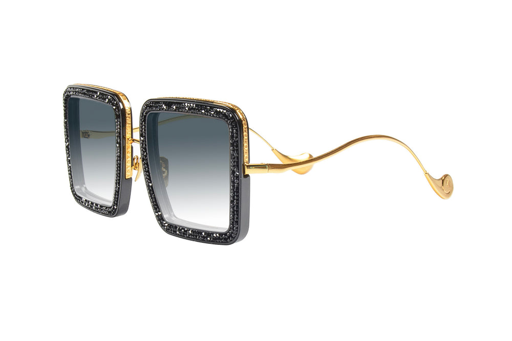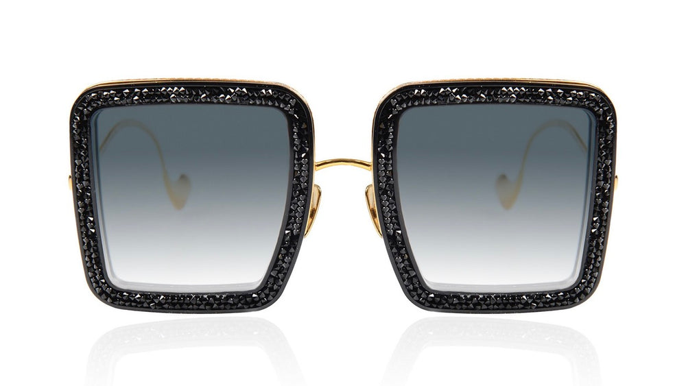 Luxurious oversized square sunglasses featuring a striking black crystal-encrusted frame border. The design combines a gold-tone metal structure with a dramatic black crystalline trim, creating a bold geometric silhouette. The gradient grey lenses are housed within the substantial square frames, while delicate gold temple arms provide an elegant contrast. The piece exemplifies high-end glamour with its combination of sparkle and sophisticated design elements.