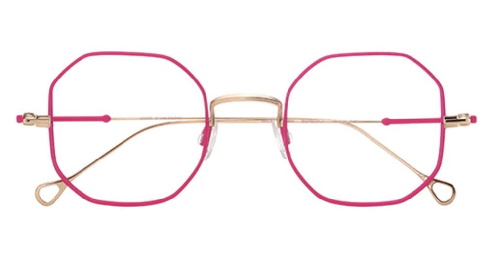 Elegant hexagonal frames featuring a delicate pink metal rim combined with gold accents on the temple arms and bridge. The design showcases a minimalist aesthetic with thin construction and subtle geometric angles, creating a sophisticated contemporary look suitable for everyday wear.