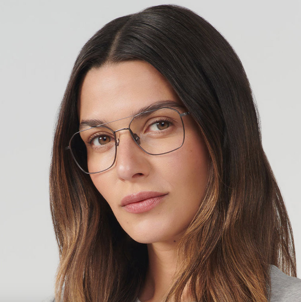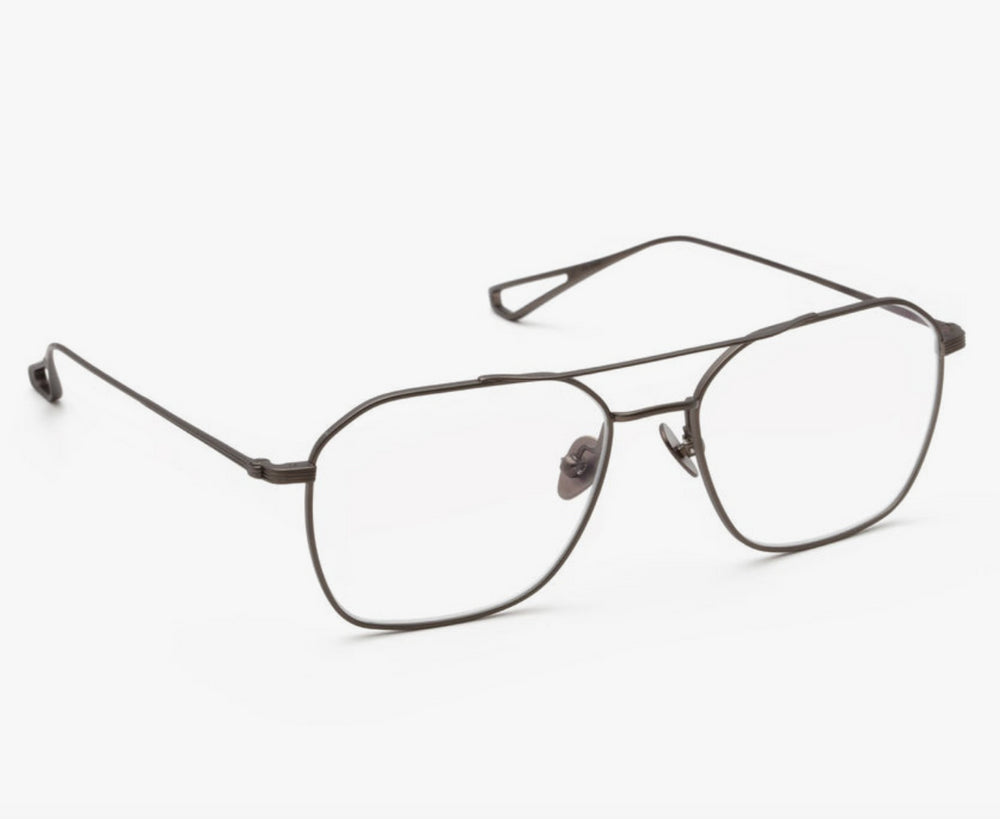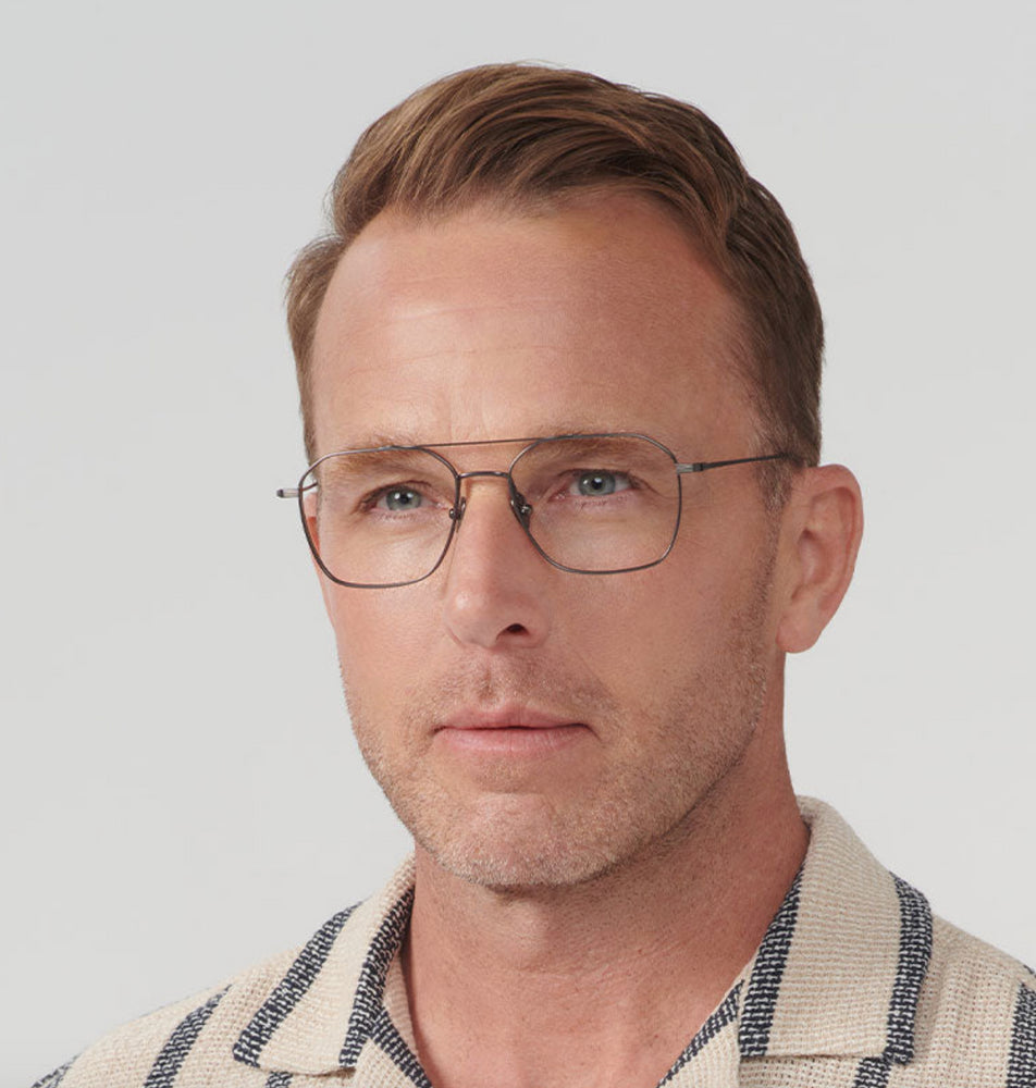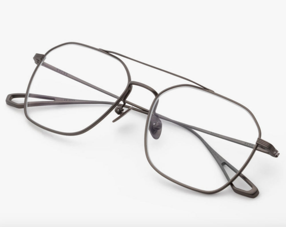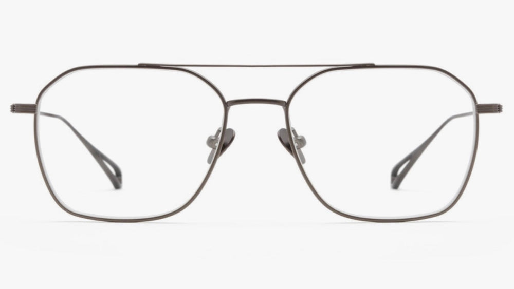 These are sophisticated square-shaped eyeglasses with a minimalist metallic bronze frame. The design features clean lines with a classic aviator-inspired double bar bridge thats sleek and modern. The thin metal construction gives them a lightweight, refined appearance while maintaining structural integrity. The temple arms are slim and streamlined, matching the overall aesthetic of understated elegance. These glasses would suit both casual and formal settings, offering a timeless look with contemporary appeal.