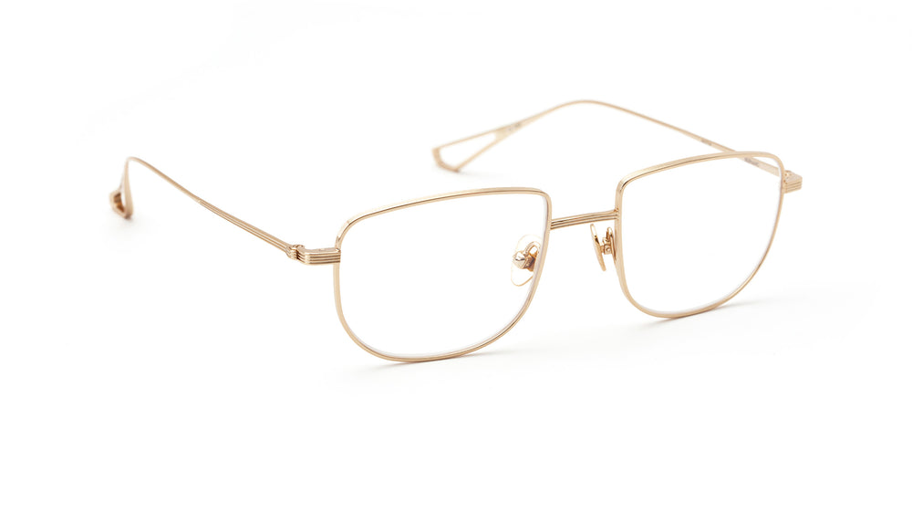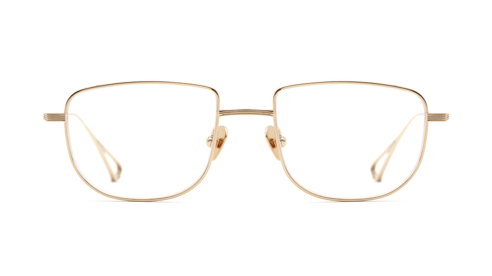 Classic rectangular aviator-inspired frames in a luxurious brushed gold finish. Features delicate linear detailing on temples and bridge, creating an elegant vintage aesthetic. The thin metal construction gives a sophisticated, lightweight appearance ideal for both professional and casual wear. The design incorporates subtle architectural elements with refined nose pads and clean lines throughout.