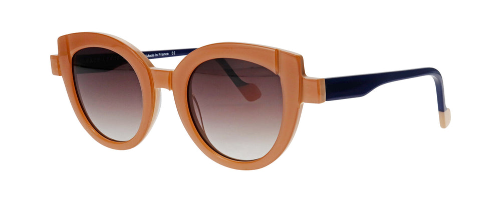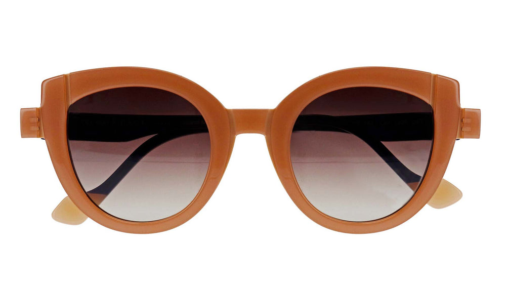 These oversized round sunglasses feature a chunky caramel-colored frame with a distinctive retro-modern aesthetic. The gradient brown lenses complement the warm tones of the frame, while the bold silhouette makes a striking fashion statement. The design combines vintage inspiration with contemporary styling, featuring smooth curves and substantial temple arms that create a balanced, sophisticated look.