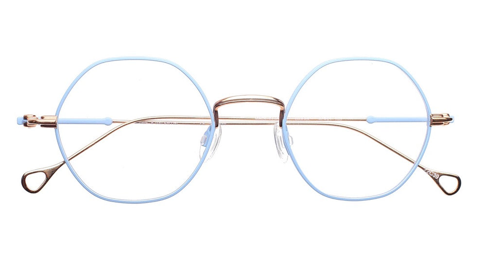 Delicate round eyeglasses featuring a lightweight metal construction with a subtle powder blue frame coating. The thin gold-toned metal framework adds elegance, while the minimalist nose pads ensure comfort. The design showcases clean lines and a perfectly circular shape that brings a sophisticated vintage-inspired aesthetic. The temple arms maintain the same refined gold finish as the bridge, creating a cohesive look. These glasses exemplify understated luxury with their balanced proportions and gentle colorway.