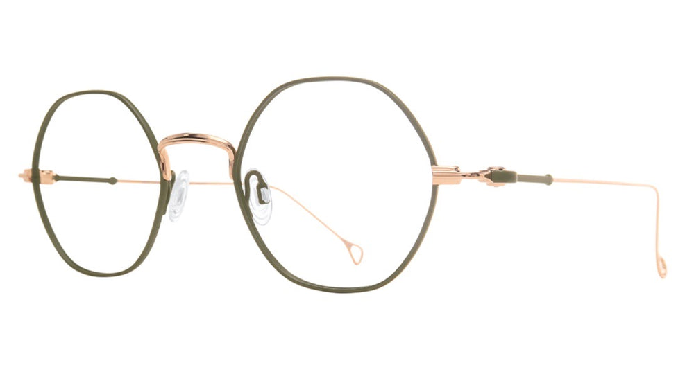 These are sophisticated round-framed glasses featuring an olive green metal frame with rose gold/bronze accents on the temple arms and bridge. The design showcases a minimalist aesthetic with delicate wire frames and adjustable nose pads. The frames have a vintage-inspired circular shape with modern styling elements. The temple arms are slim and feature a subtle curved design that adds both comfort and style. These glasses embody a perfect blend of retro charm and contemporary elegance.