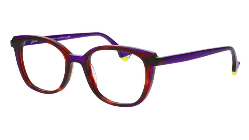 This is a sophisticated designer eyewear piece featuring a unique gradient coloring from deep tortoise-red at the front transitioning to vibrant purple temple arms. The frame has a contemporary square silhouette with softened edges, creating a modern yet wearable look. A subtle yellow accent detail appears near the temples, adding an unexpected pop of color. The construction appears sturdy and well-crafted, with smooth transitions between colors and materials. The design balances bold styling with practical wearability, making it suitable for fashion-forward individuals seeking a distinctive look.