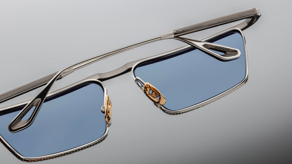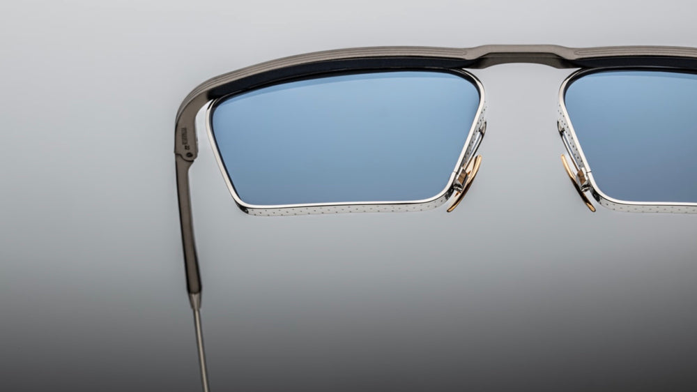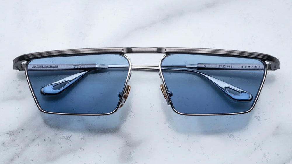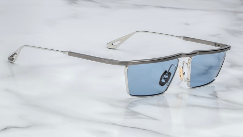 Sleek and sophisticated geometric sunglasses featuring a distinctive architectural design with angular lines. The frame combines a matte black top bar with polished silver accents and nose bridge. The blue-tinted lenses are set within a sharp-edged geometric shape that creates a bold, avant-garde aesthetic. The design showcases precision engineering with clean lines and modern minimalist styling, perfect for the fashion-forward individual seeking a luxury eyewear statement piece.