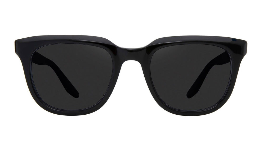 Classic wayfarer-style sunglasses with a sleek, minimalist design. The frames feature a squared-off silhouette with straight top lines and slightly rounded bottom edges. Made of high-quality black polished plastic with a sophisticated matte finish. The sunglasses have dark tinted lenses and maintain a timeless, versatile aesthetic that would complement any face shape or style. The design emphasizes clean lines and professional appearance, making them suitable for both casual and formal occasions.