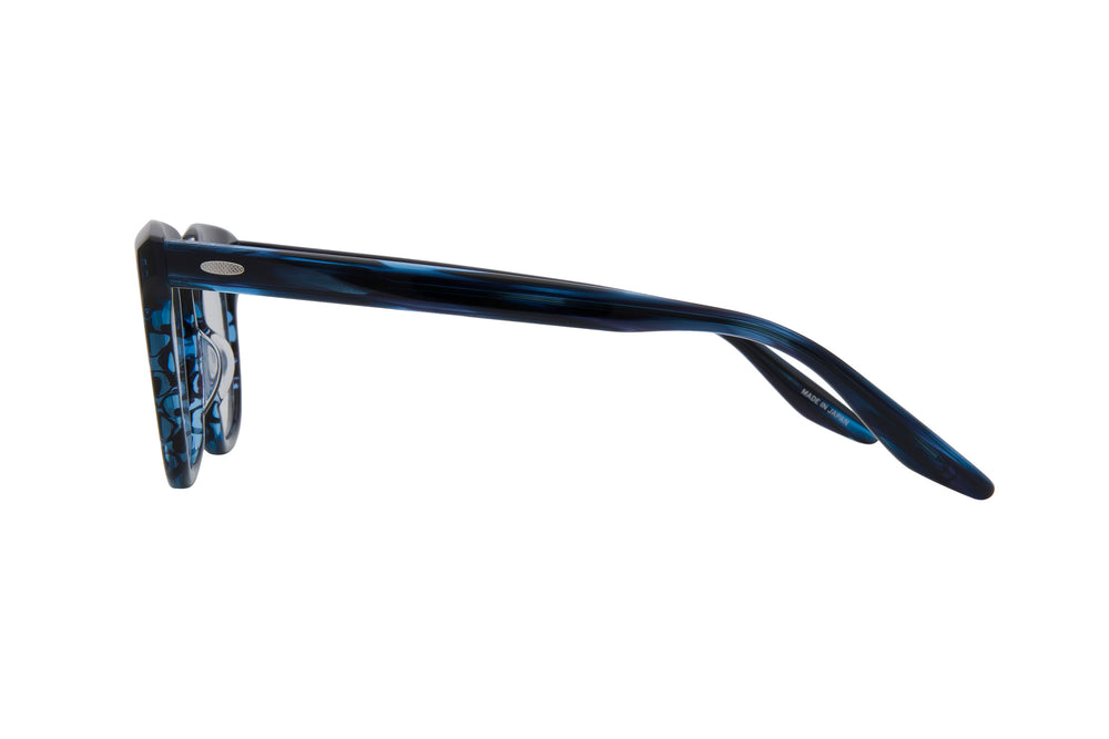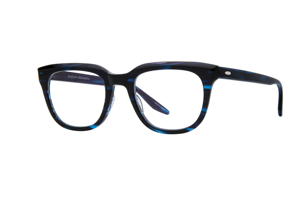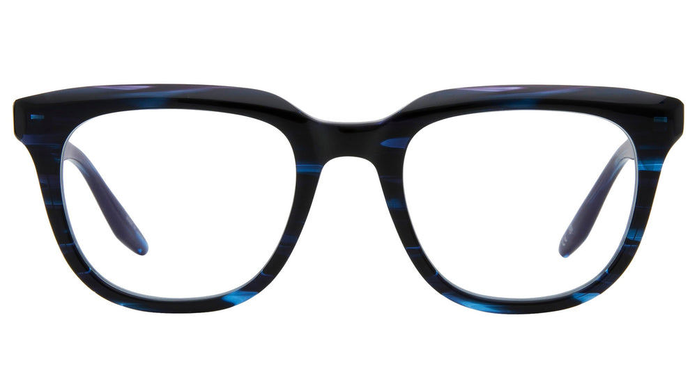 A sophisticated square-framed optical design featuring a striking blue-black striped pattern throughout the frame. The glasses showcase a substantial acetate construction with clean, architectural lines and a contemporary silhouette. The frame exhibits a beautiful depth effect with translucent blue streaks running through a darker base, creating an elegant marbled appearance. The saddle bridge and temple arms maintain the same striking color pattern, giving these glasses a cohesive, premium look suitable for both professional and casual wear.