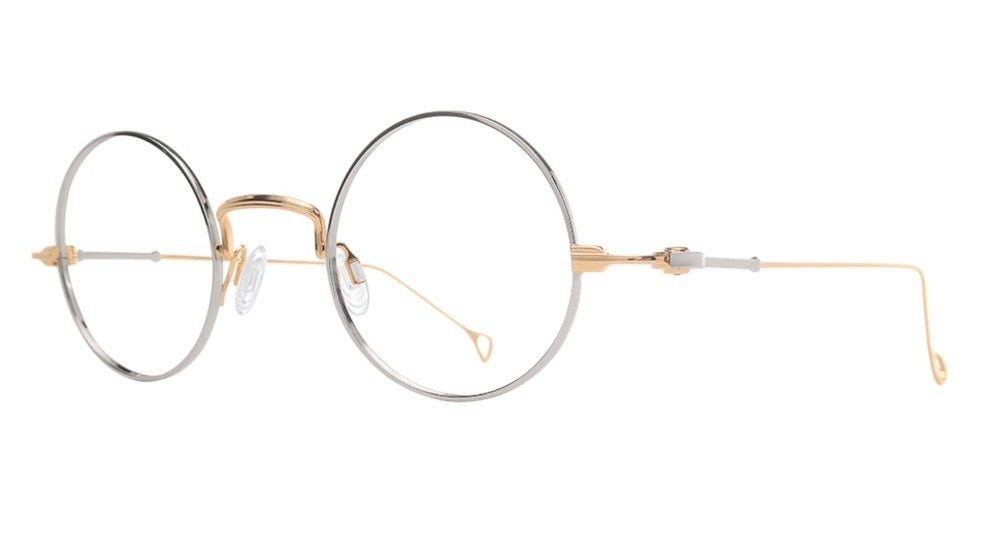 Classic round metal eyeglasses featuring a minimalist design with thin silver frames and gold accents on the bridge and temple arms. The frame has a vintage-inspired aesthetic with delicate proportions and a sophisticated two-tone metallic finish. The circular lenses are perfectly balanced with adjustable nose pads for comfort. The slender temple arms feature a subtle curve and terminate in small protective end pieces.
