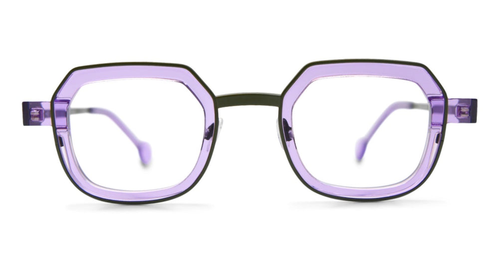These striking geometric frames feature a unique hybrid construction with a black metal outline and transparent purple acetate inner frame. The design has an avant-garde, architectural quality with its angular hexagonal shape. The temple arms transition smoothly from metal to purple acetate, creating an interesting two-tone effect. The modern silhouette is balanced by the delicate nose bridge and refined proportions, making it a sophisticated choice for those seeking distinctive eyewear.
