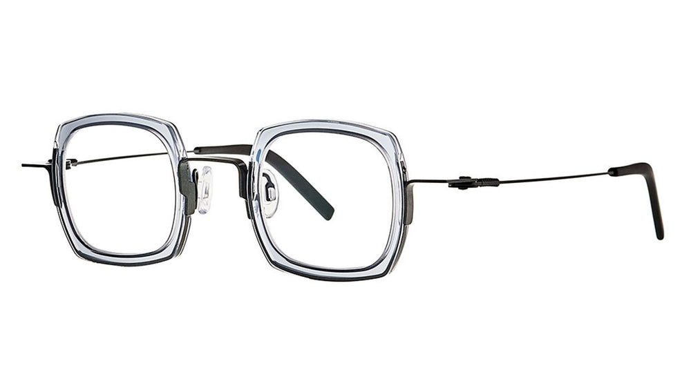 These distinctive eyeglasses feature a unique squared-geometric frame design with a translucent grey acetate outer rim surrounding a thin black metal inner frame. The design showcases a minimalist double bridge construction with delicate nose pads, creating an architectural, avant-garde aesthetic. The temple arms are sleek and slim in black metal, with subtle hinges that complement the frames modern, artistic appeal. The overall design strikes a balance between bold geometric shapes and refined metalwork, making it a sophisticated choice for those seeking a contemporary, fashion-forward look.