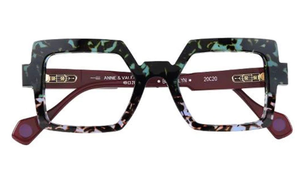 These are bold, avant-garde geometric frames from ANNE ET VALENTINs BROOKLYN collection. The frames feature a distinctive angular square shape with chunky tortoiseshell acetate in blue-green tones. The temples are a deep burgundy brown color, creating an interesting contrast. The frames have a strong architectural presence with sharp angles and a substantial build, making them a striking statement piece. Small decorative metal details appear on the temple arms. The design combines contemporary geometric styling with artisanal quality for a sophisticated intellectual look.
