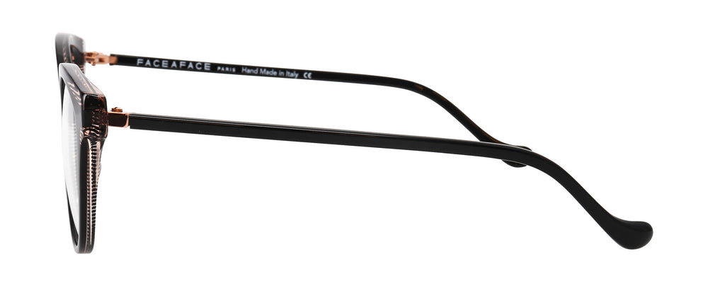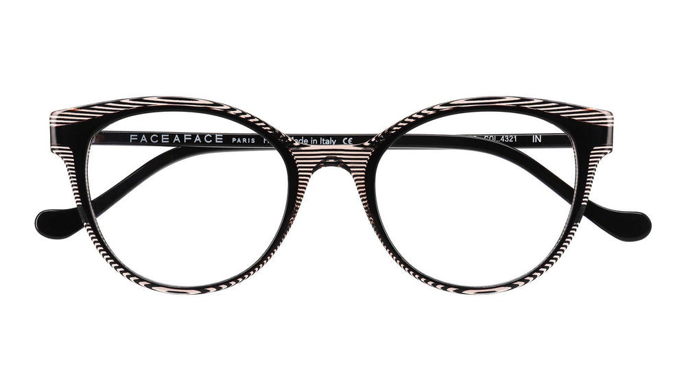 Striking contemporary round eyeglasses with a distinctive striped texture pattern in black and white throughout the frame. Made in Italy by FACE A FACE Paris, these frames feature an artistic linear design that creates visual depth and modern sophistication. The pattern gives a unique optical illusion effect while maintaining a clean, professional silhouette.