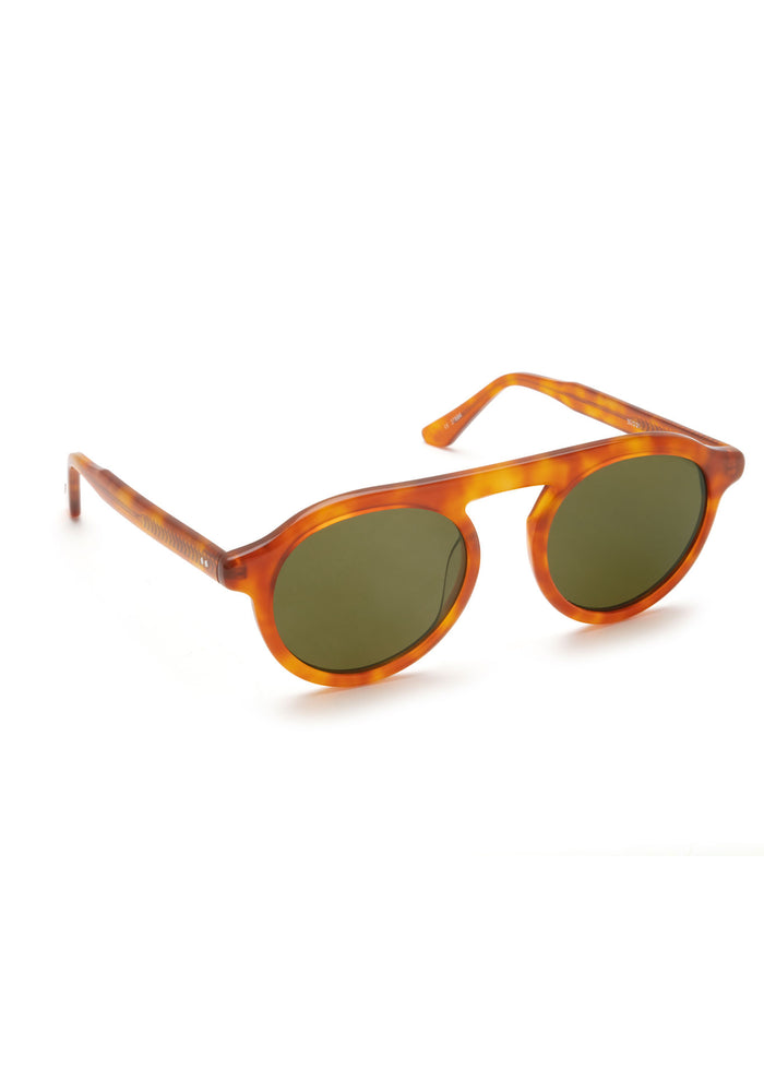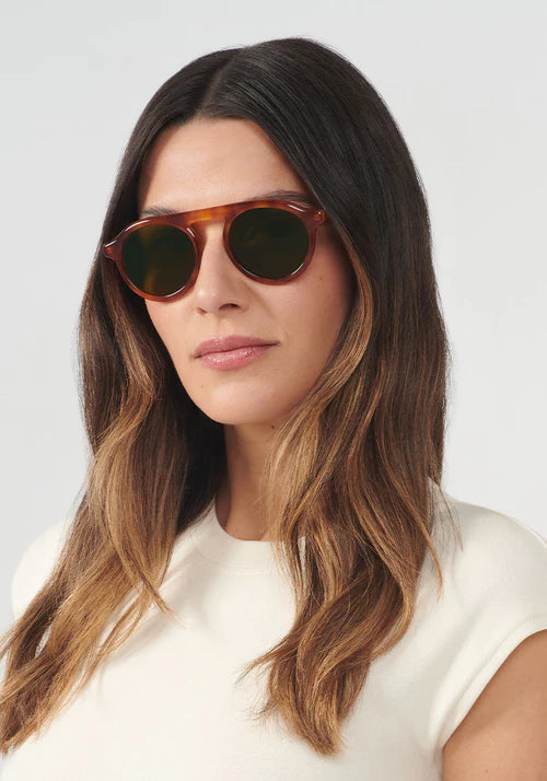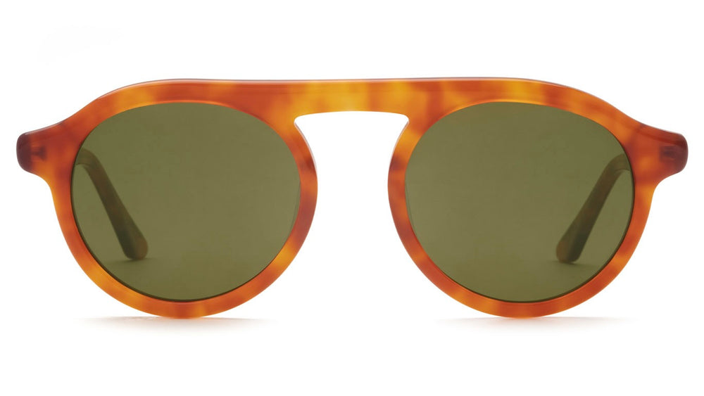 Classic round sunglasses with a timeless tortoiseshell acetate frame in warm honey and amber tones. Features a prominent double bridge design and green-tinted lenses that provide excellent sun protection. The frame has a sophisticated retro-inspired silhouette with balanced proportions and a sturdy build quality, making it suitable for everyday wear. The tortoiseshell pattern shows beautiful variation and depth in the material.