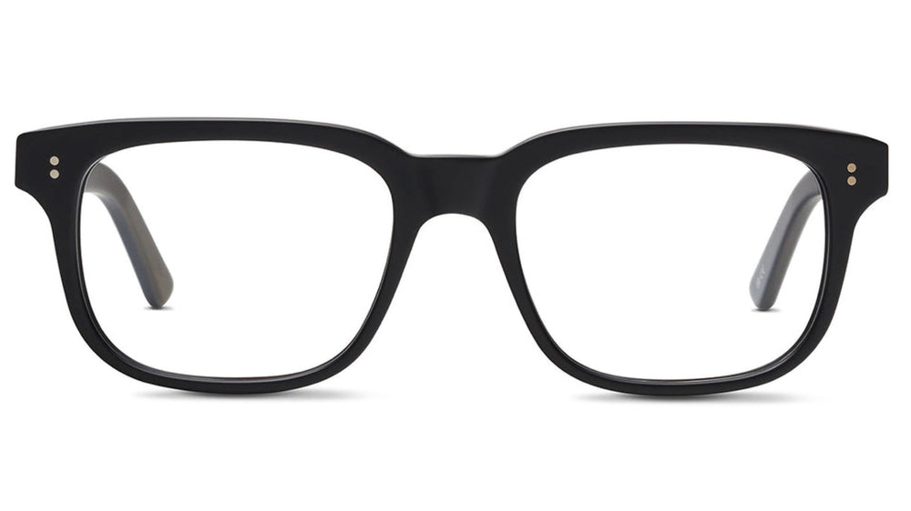 Classic rectangular wayfarer-style frames with a refined minimalist design. Features subtle three-dot detailing on the temples, giving it a sophisticated touch. The frame has clean lines and a timeless silhouette that would suit most face shapes. The matte black finish provides a versatile, professional look suitable for both casual and formal settings.