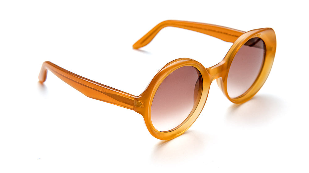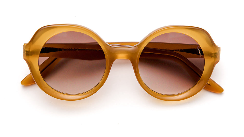 A luxurious pair of oversized round sunglasses from LAPIMAs CARLOTA collection. The frames feature a stunning translucent honey-amber color throughout, with thick, bold rims that make a striking statement. The gradient brown lenses complement the warm tones of the frame perfectly. The design showcases smooth, curved lines with no sharp angles, creating a sophisticated vintage-inspired aesthetic. The seamless construction and high-quality plastic material suggest premium craftsmanship typical of luxury eyewear.