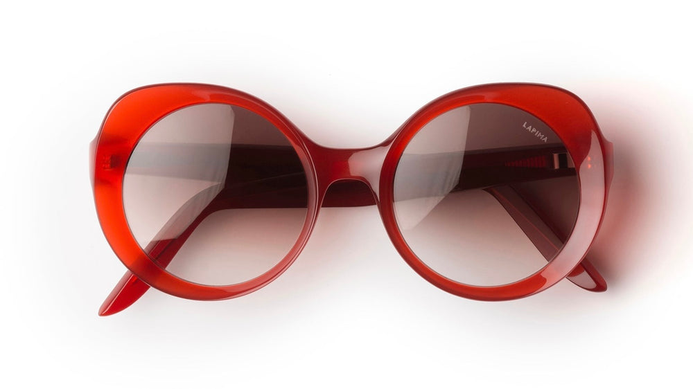 Elegant oversized round sunglasses in a translucent deep red color. The frames feature a bold, retro-inspired silhouette with generously proportioned circular lenses and gradient brown tinting. The design showcases smooth, curved temple arms and a classic saddle bridge, creating a sophisticated vintage aesthetic. These statement sunglasses have a luxurious finish that would complement both casual and formal attire.