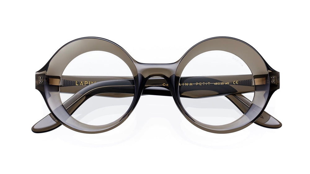 These are sophisticated round-frame glasses with a contemporary twist featuring a translucent grey gradient acetate frame. The design shows attention to detail with its clean lines and minimalist aesthetic. The frames have a subtle ombré effect transitioning from darker to lighter tones, which adds visual interest while maintaining professional elegance. LAPIMA branding is subtly visible on the temple arms. The glasses have a vintage-inspired silhouette with modern execution, making them versatile for both casual and formal wear.