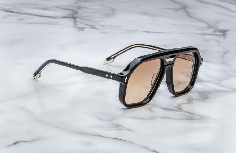 A sophisticated oversized aviator-style frame with a bold, architectural design featuring a prominent brow bar and temple detailing. The frame has a matte black finish with striking geometric lines and gold accents on the bridge. The brown gradient lenses complement the vintage-inspired aesthetic, while the thick acetate construction gives these sunglasses a substantial, premium feel. Notable design elements include decorative linear patterns on the temple arms and subtle diamond-shaped accents at the front corners.