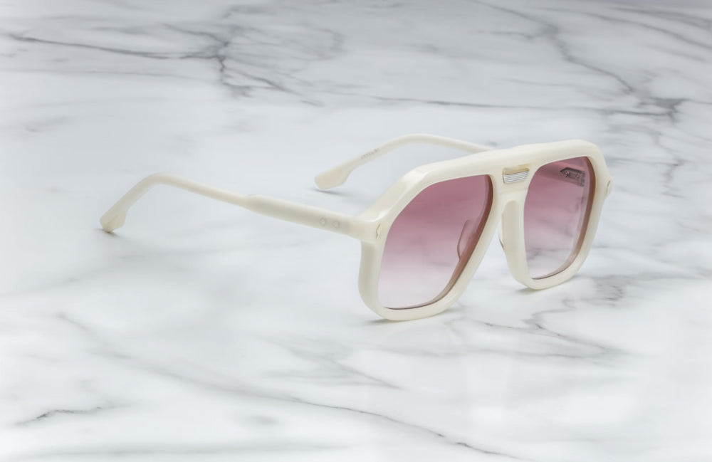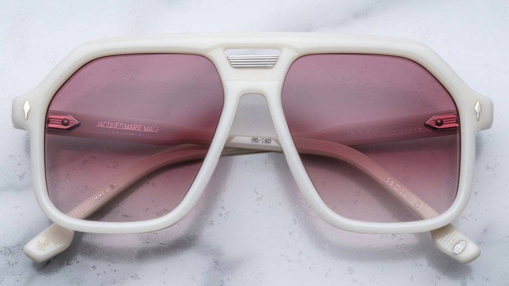 These JACQUES MARIE MAGE sunglasses feature a bold retro-inspired aviator silhouette with a distinctive thick white plastic frame. The oversized square-aviator shape is complemented by gradient pink-tinted lenses. The frame has a premium matte finish with subtle architectural detailing on the bridge and temples. Small diamond-shaped accents appear on both sides of the frame front. The design balances vintage aesthetics with contemporary luxury, featuring substantial temple arms and a prominent brow bar that creates a striking geometric profile.