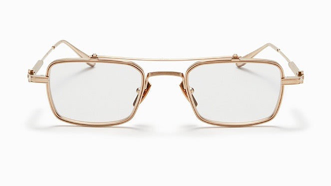 Sophisticated rectangular metal frames in a polished gold finish with slim profile and adjustable nose pads. Features a minimalist double bridge design and sleek temple arms. The frames have a refined professional appearance with clear lenses and precise geometric angles, making them suitable for both business and casual wear.