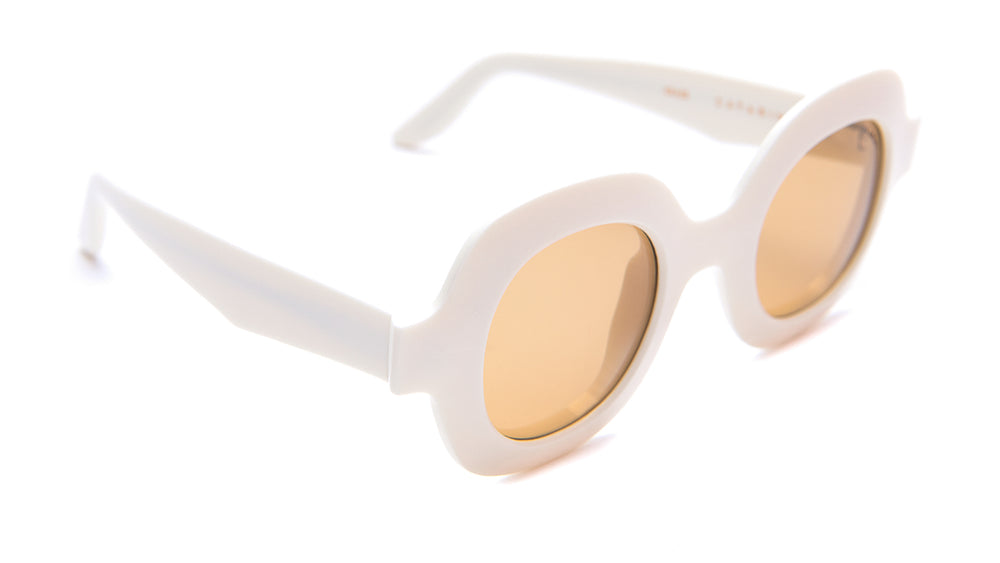 A bold and striking pair of oversized round sunglasses with a luxurious white matte finish frame. The thick, sculptural frame features a distinctive retro-inspired silhouette with amber-tinted lenses. The design showcases clean lines and minimalist aesthetics, with integrated nose pads and smooth temple arms that curve gently behind the ears. The sunglasses exude a contemporary yet timeless appeal, perfect for making a fashion statement while providing sun protection. The frames substantial build quality suggests durability and premium craftsmanship, characteristic of high-end eyewear.