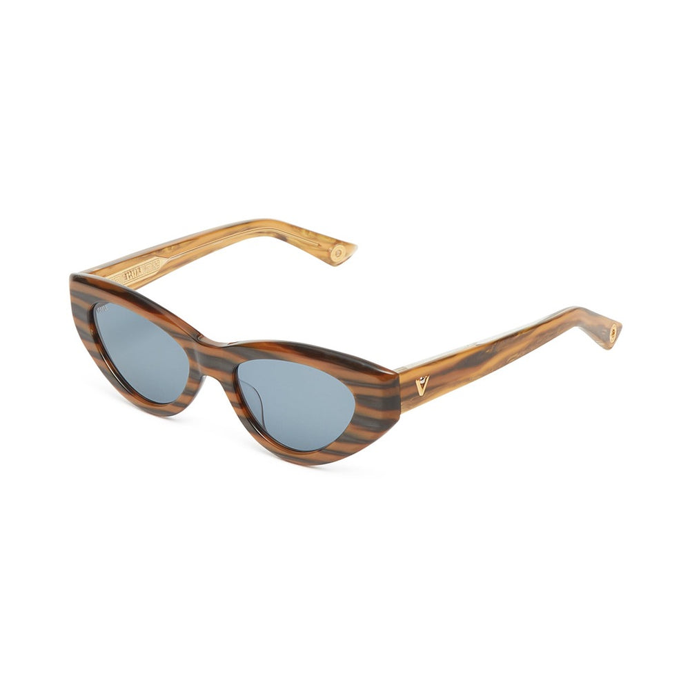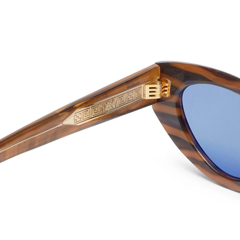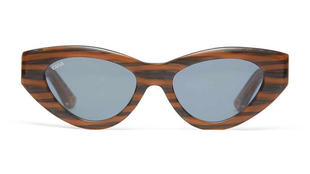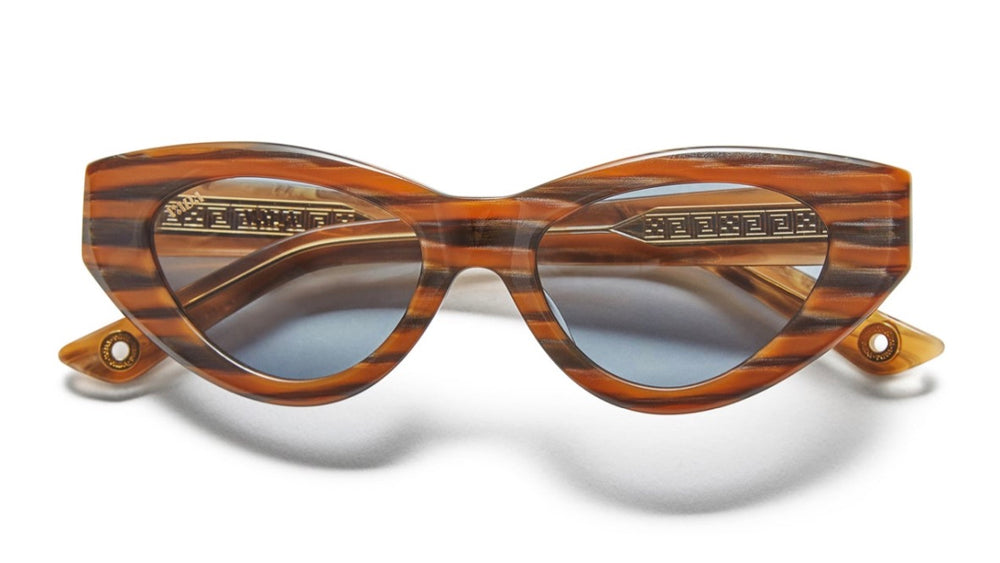 These are bold, retro-inspired cat-eye sunglasses featuring a striking striped tortoiseshell pattern in brown and black tones. The frames have a dramatic upswept shape with a substantial thickness that makes a strong statement. The lenses are a cool grey tone, and the overall design has a vintage-meets-modern aesthetic that would complement many face shapes. The striped pattern gives these sunglasses a unique, textured appearance that adds visual interest to the classic cat-eye silhouette.