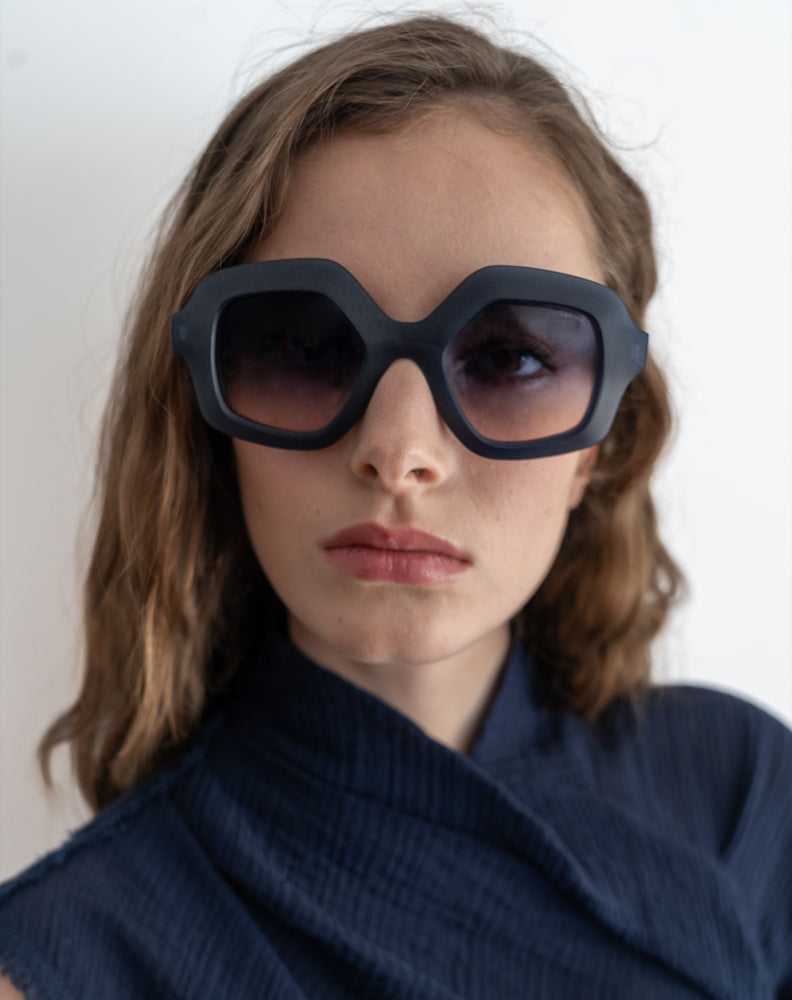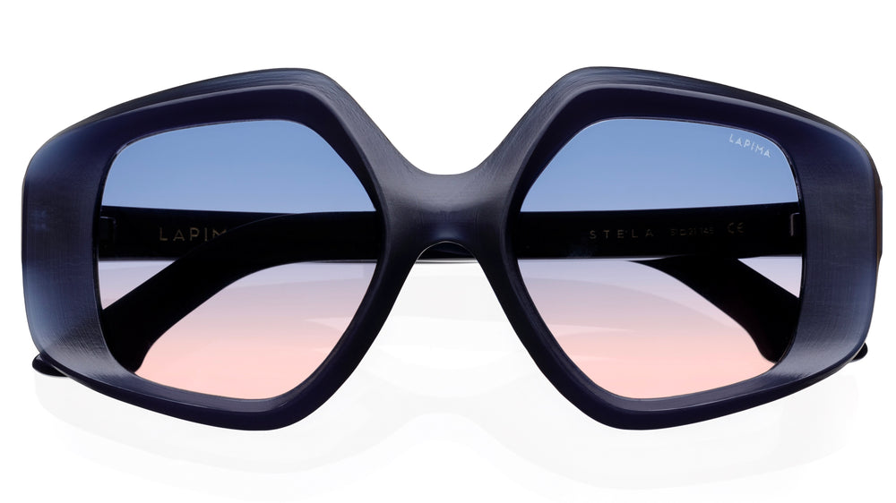 These are bold, oversized geometric sunglasses with a distinctive angular shape and thick black frames. The lenses feature a gradient effect transitioning from blue at the top to pink/peach at the bottom. The chunky, architectural design has a luxurious, high-fashion aesthetic with sharp angles and clean lines. The frames have a matte black finish and substantial temple arms that complement the bold front profile. These statement sunglasses embody contemporary elegance with their dramatic proportions and sophisticated color combination.