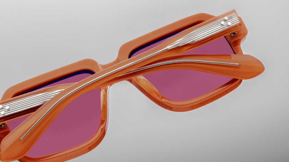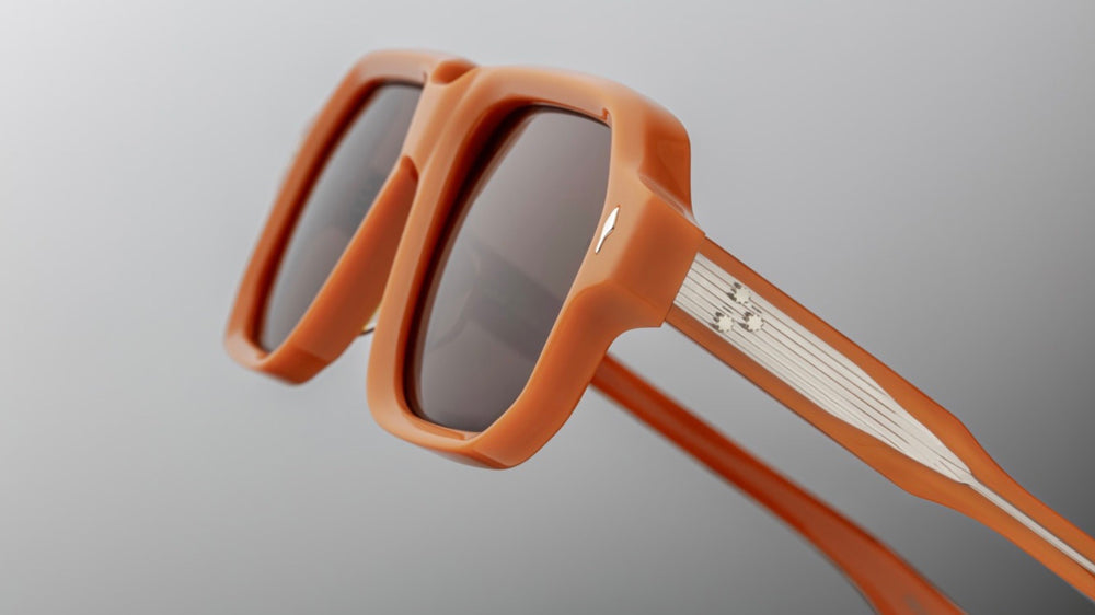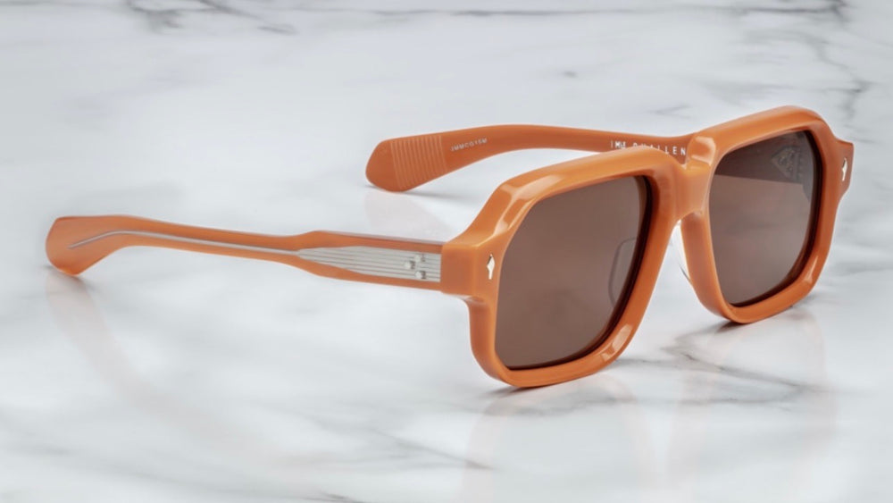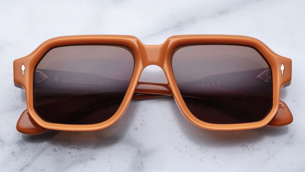 A sophisticated oversized square-frame sunglasses in a matte terracotta orange color. The design features a bold, architectural silhouette with substantial thickness and clean lines. Small diamond-shaped accents appear on the front corners. The sunglasses exhibit a premium vintage-inspired aesthetic with gradient brown lenses and a seamless construction that speaks to luxury craftsmanship.