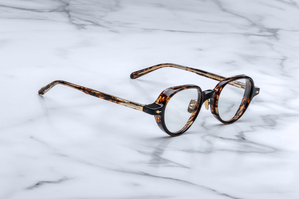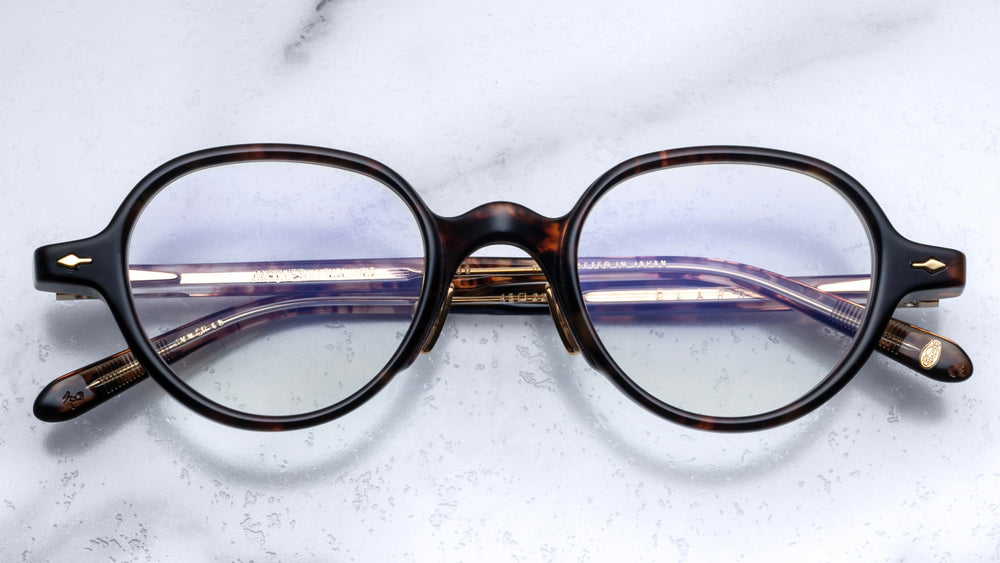 The CLARK features a sophisticated round silhouette with a dark tortoiseshell acetate frame that exudes vintage charm. The frame has a substantial build with elegant contouring and a slightly upswept browline. The design showcases fine craftsmanship with subtle gold accents on the temple hinges. The lenses are generously sized and the overall aesthetic strikes a perfect balance between classic styling and contemporary luxury eyewear design.