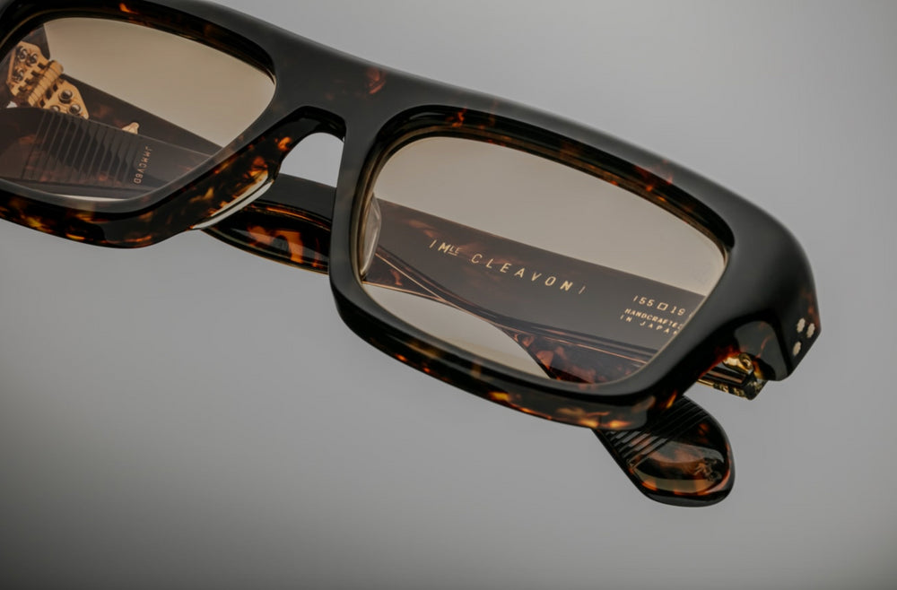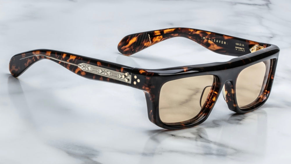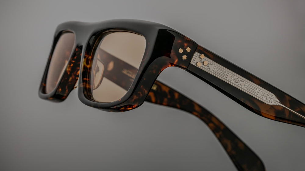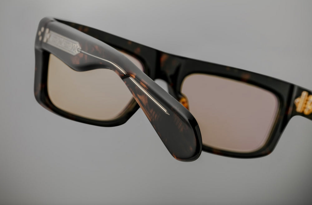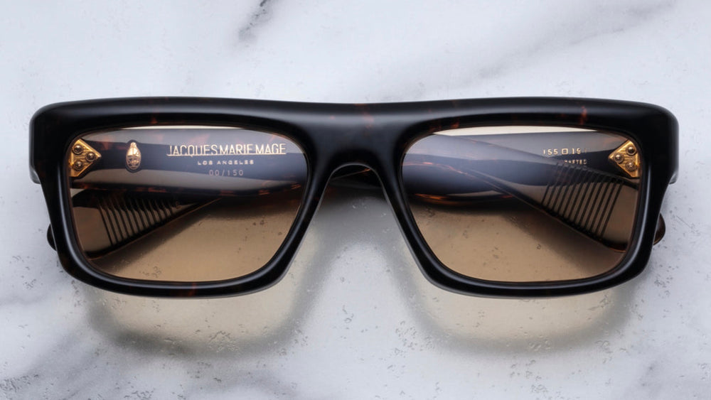 A luxurious pair of Jacques Marie Mage sunglasses featuring a bold, rectangular silhouette with thick black frames. The design showcases elegant gold accents on the temple corners, adding a sophisticated touch. The glasses appear to be a limited edition (numbered 00/150) from their Los Angeles collection. The gradient brown lenses complement the classic black frame perfectly. The substantial build quality and architectural styling exemplifies high-end craftsmanship, with clean lines and a masculine yet versatile aesthetic suitable for any face shape.