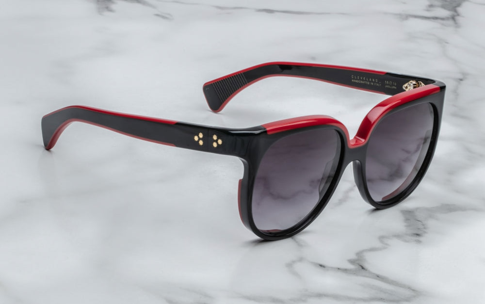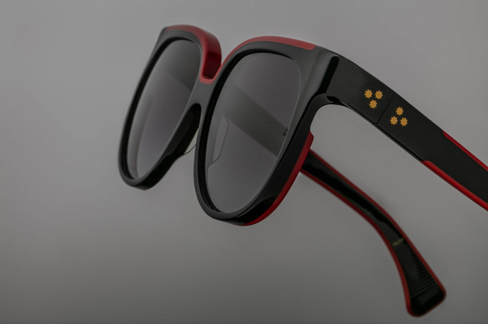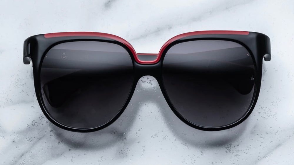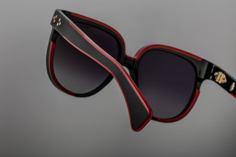 A sophisticated oversized oval-shaped sunglasses featuring a glossy black acetate frame with striking red accent detailing along the top bridge area. The design showcases a bold, retro-contemporary aesthetic with substantial frame thickness and sleek temple arms. The large gradient lenses and clean architectural lines create a luxurious, statement-making eyewear piece that balances vintage inspiration with modern sophistication.
