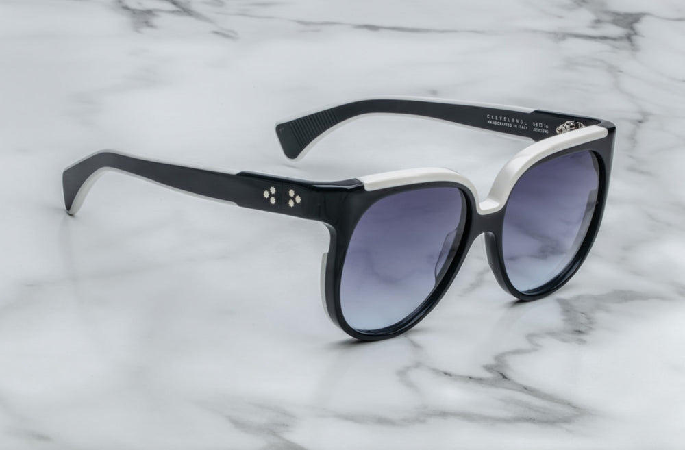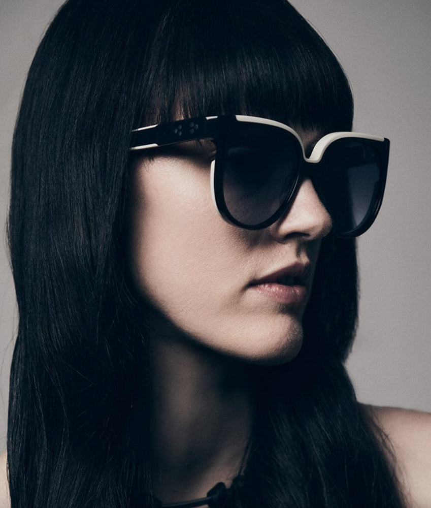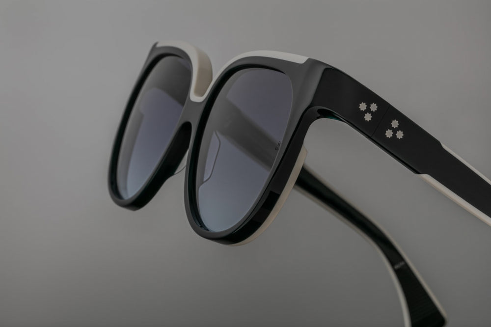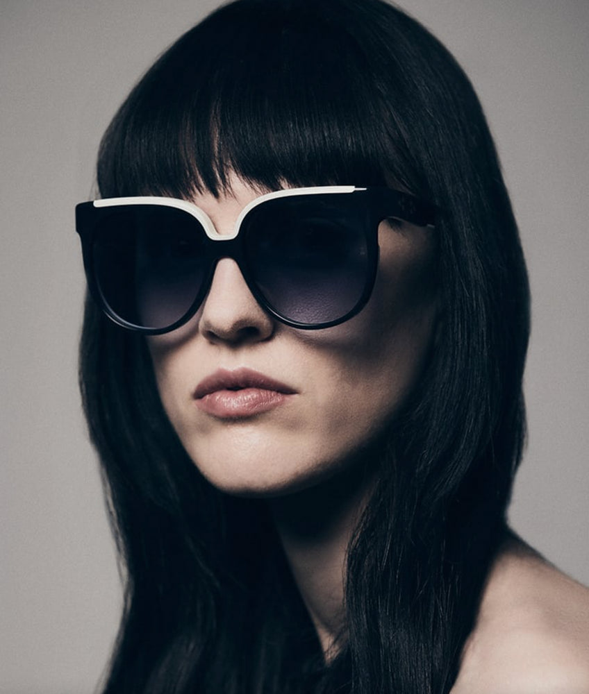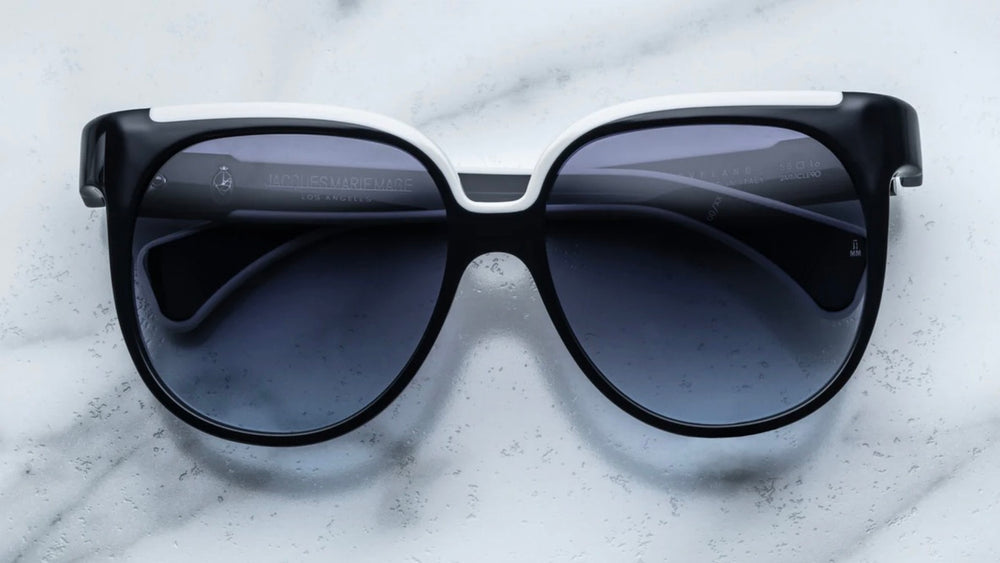 A sophisticated oversized geometric frame with a striking black and white color contrast. The frame features a bold thick plastic construction with a prominent white accent along the top bridge area. The sunglasses have a luxurious retro-contemporary aesthetic typical of Jacques Marie Mage designs, with gradient grey lenses and clean architectural lines. The generous lens size and substantial frame thickness create a statement look that balances bold styling with refined elegance.