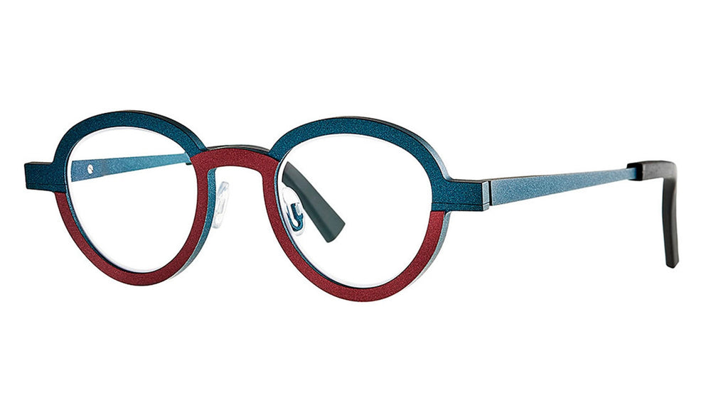 Modern round split-color eyeglasses featuring a unique two-tone design with red lower rims and blue upper rims and temples. The frame has a distinctive architectural quality with clean lines and a contemporary minimalist aesthetic. The design showcases an interesting contrast between the warm red and cool blue tones, creating a bold yet sophisticated look. The frame appears to have a matte metallic finish, giving it an industrial-modern feel while maintaining elegance.