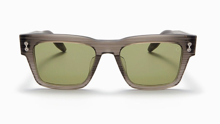 Sophisticated square-framed sunglasses with a distinctive wood-grain textured grey finish. The design features clean geometric lines and subtle silver accents on the temple hinges. The green-tinted lenses are complemented by the substantial frame thickness, creating a bold contemporary look. The sunglasses demonstrate excellent craftsmanship with seamless construction and a modern minimalist aesthetic that would appeal to style-conscious individuals.